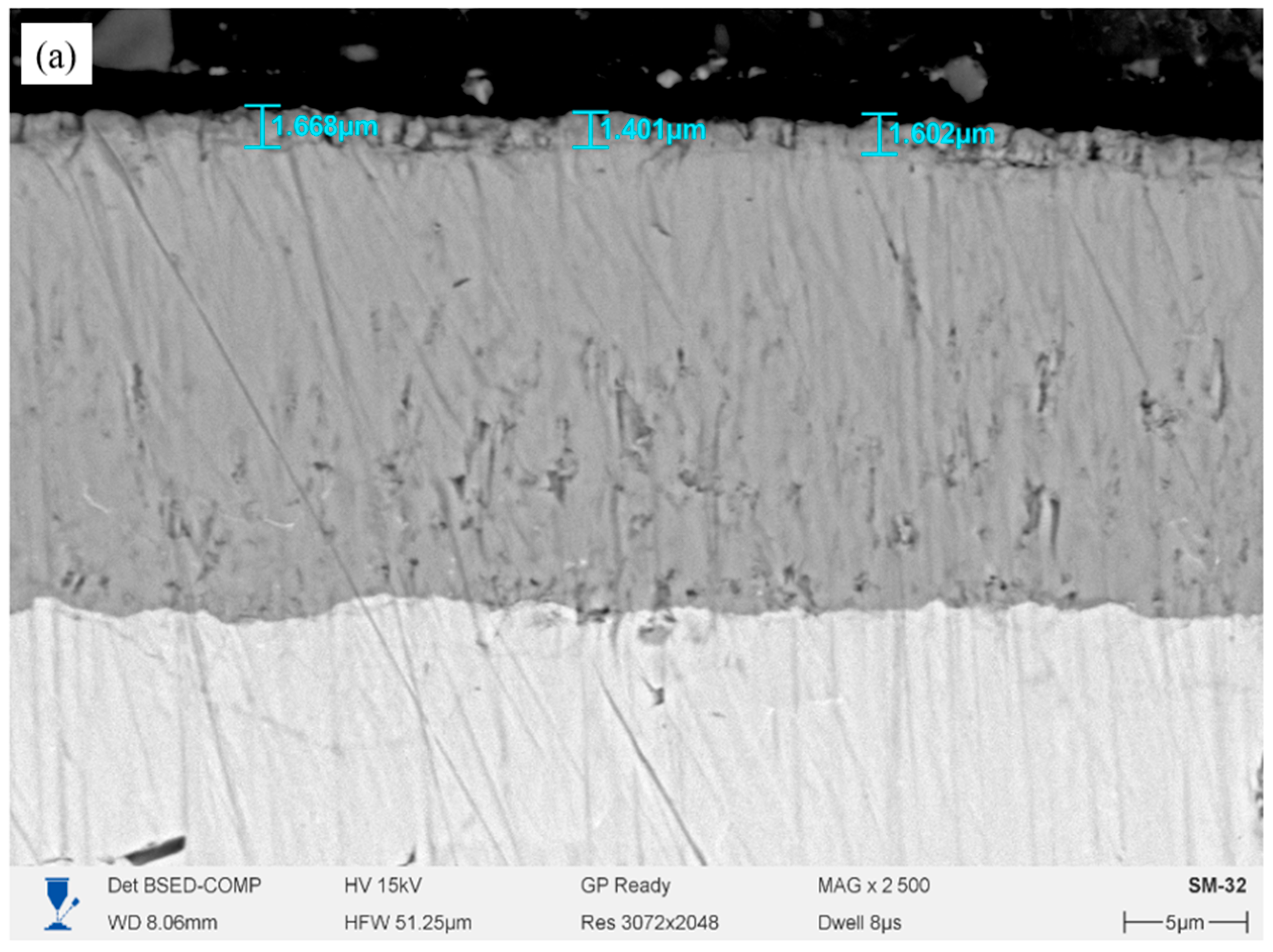 Figure 7a), significant oxygen enrichment is observed near the surface of the E110 alloy substrate after testing, indicating the formation of a continuous ZrO