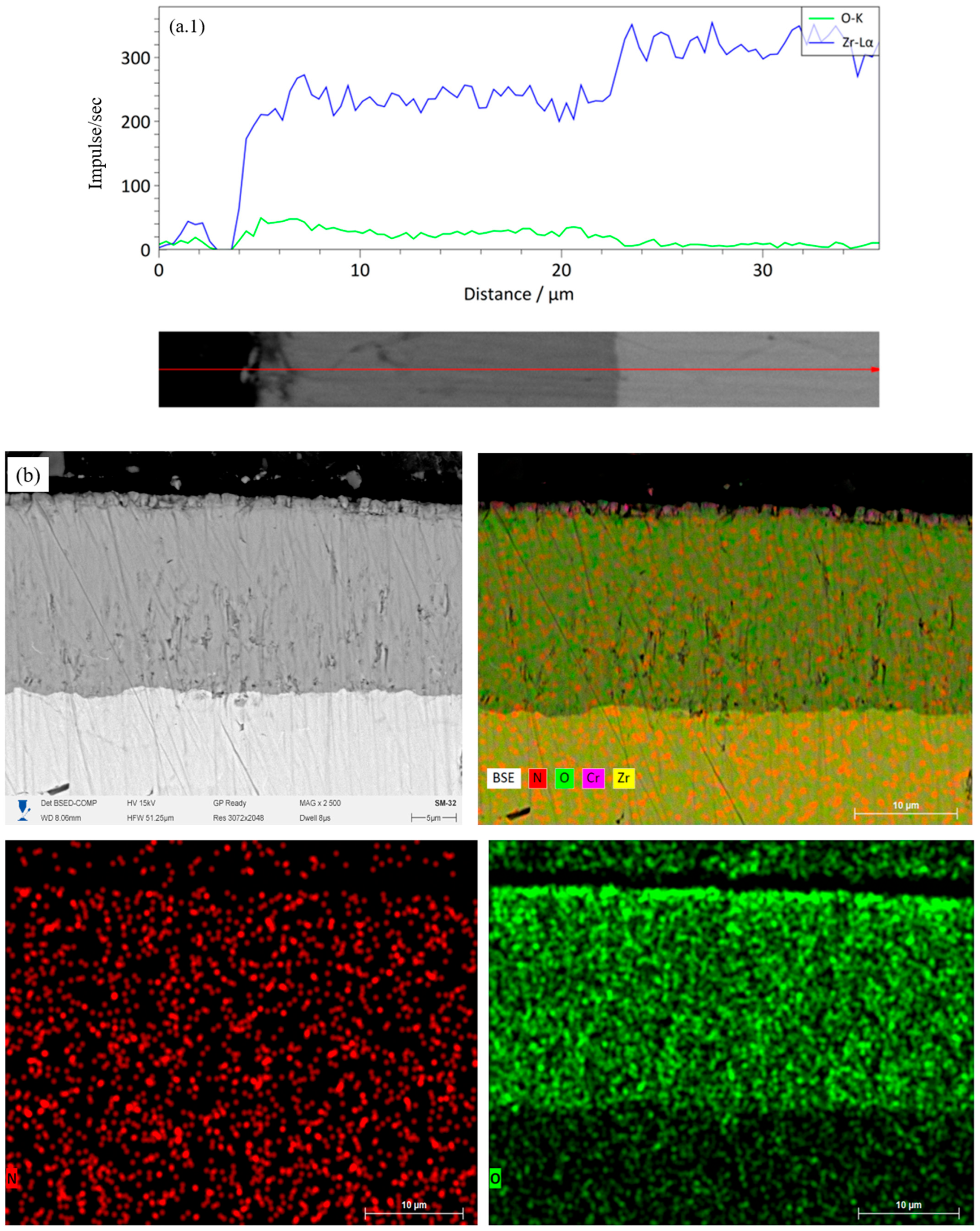 Figure 7(a.1)) shows a high Zr signal across the thickness, while the oxygen gradually increases from the inner layers to the surface. For the single-layer CrN coating (