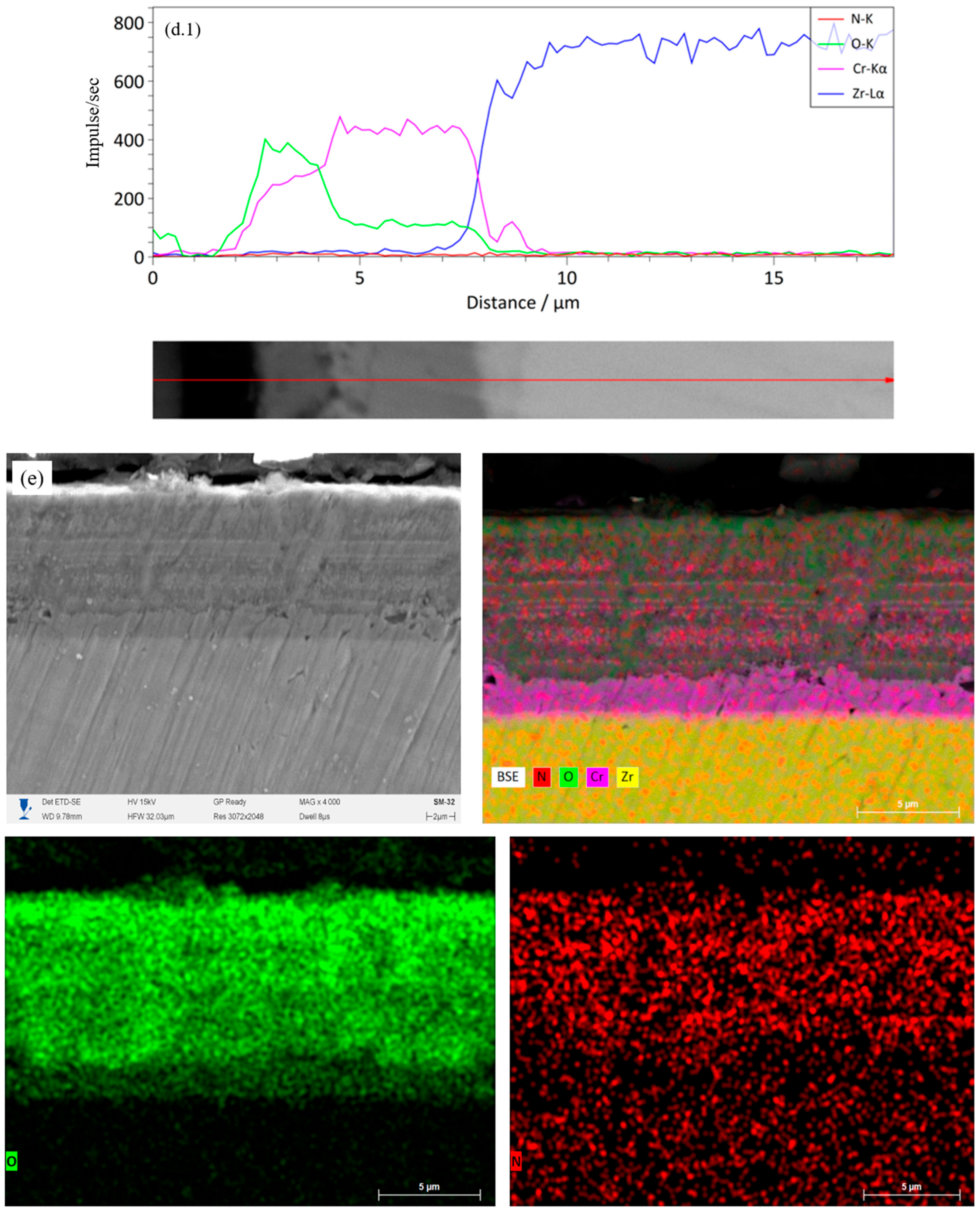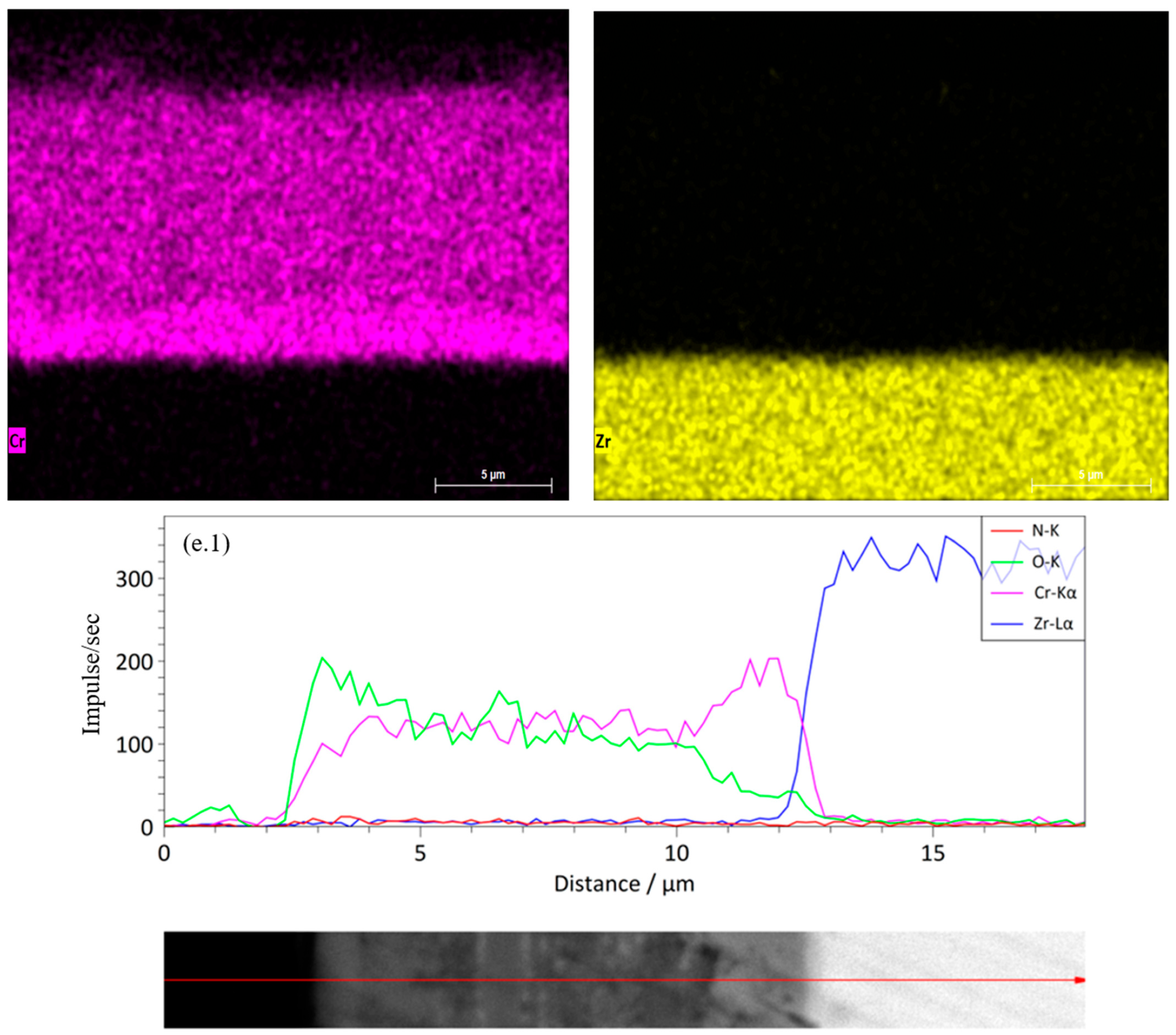 Figure 7(e.1)), Cr and N are distributed stably, while Zr maintains a sharp transition at the substrate-coating interface. This structure ensures superior thermal stability and minimal diffusion of elements between the substrate and coating. Thus, the results of EDS mapping and linear analysis confirm the high thermal stability of multilayer Cr/CrN coatings and the effectiveness of their barrier properties when exposed to saturated water vapor at 1100 °C.