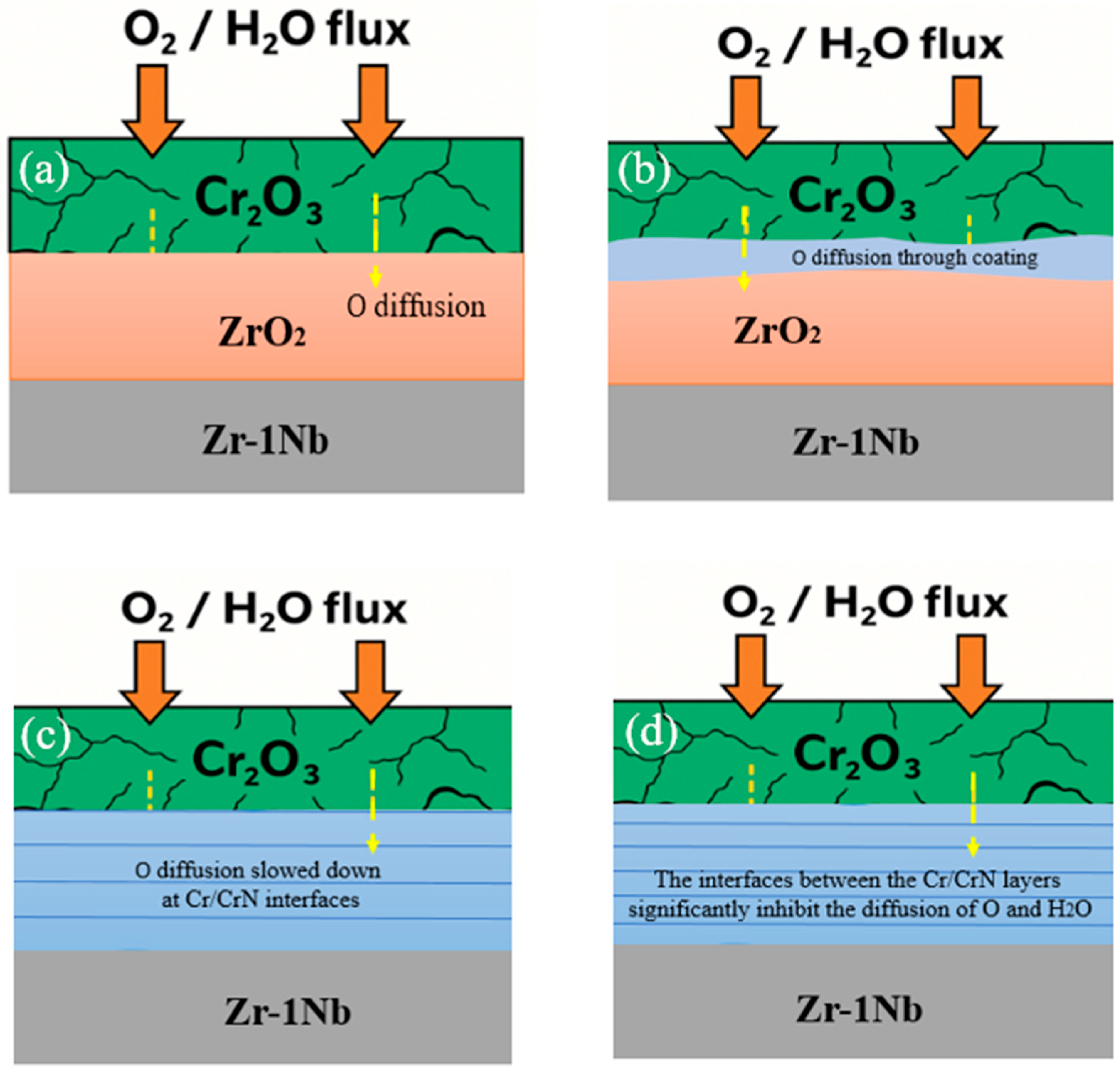 3 is observed. To investigate the resistance of various coatings to high-temperature steam oxidation, the evolution of single- and multilayer CrN and (CrN/Cr)ₙ systems after HTSO at 1100 °C for 2 h was assessed. The interpretation of the results was compared with the oxidation model schematically presented in