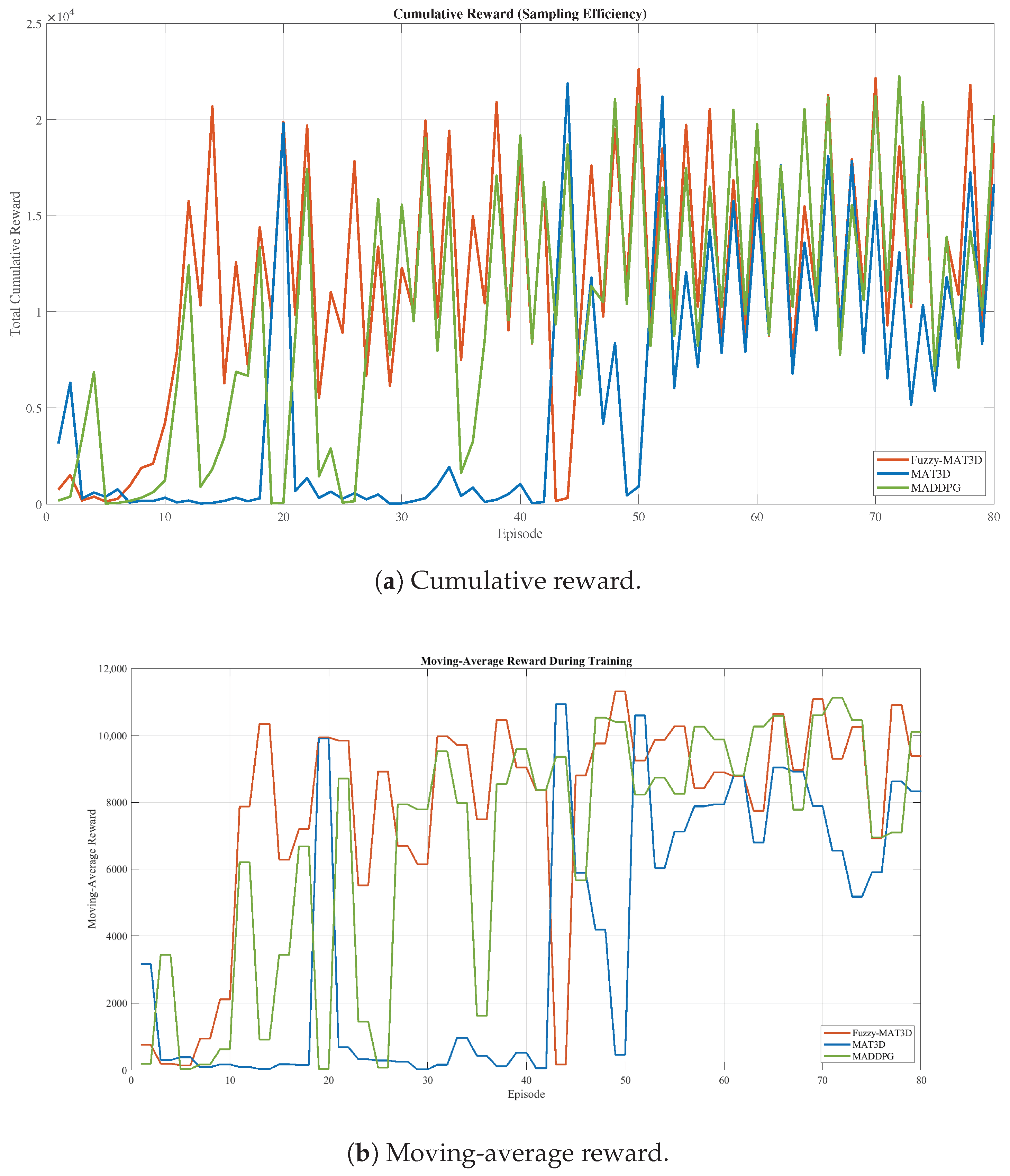with markedly lower steady-state oscillation than MAT3D and MADDPG. Conversely, Fuzzy–MAT3D exhibits a larger settling time