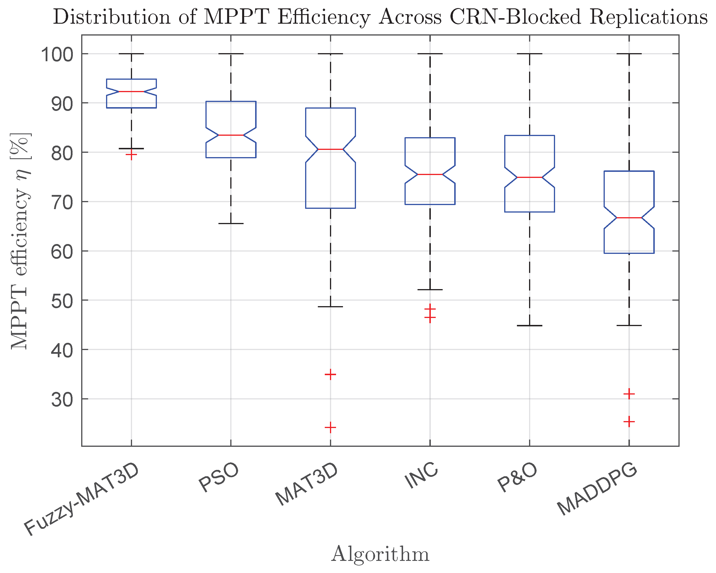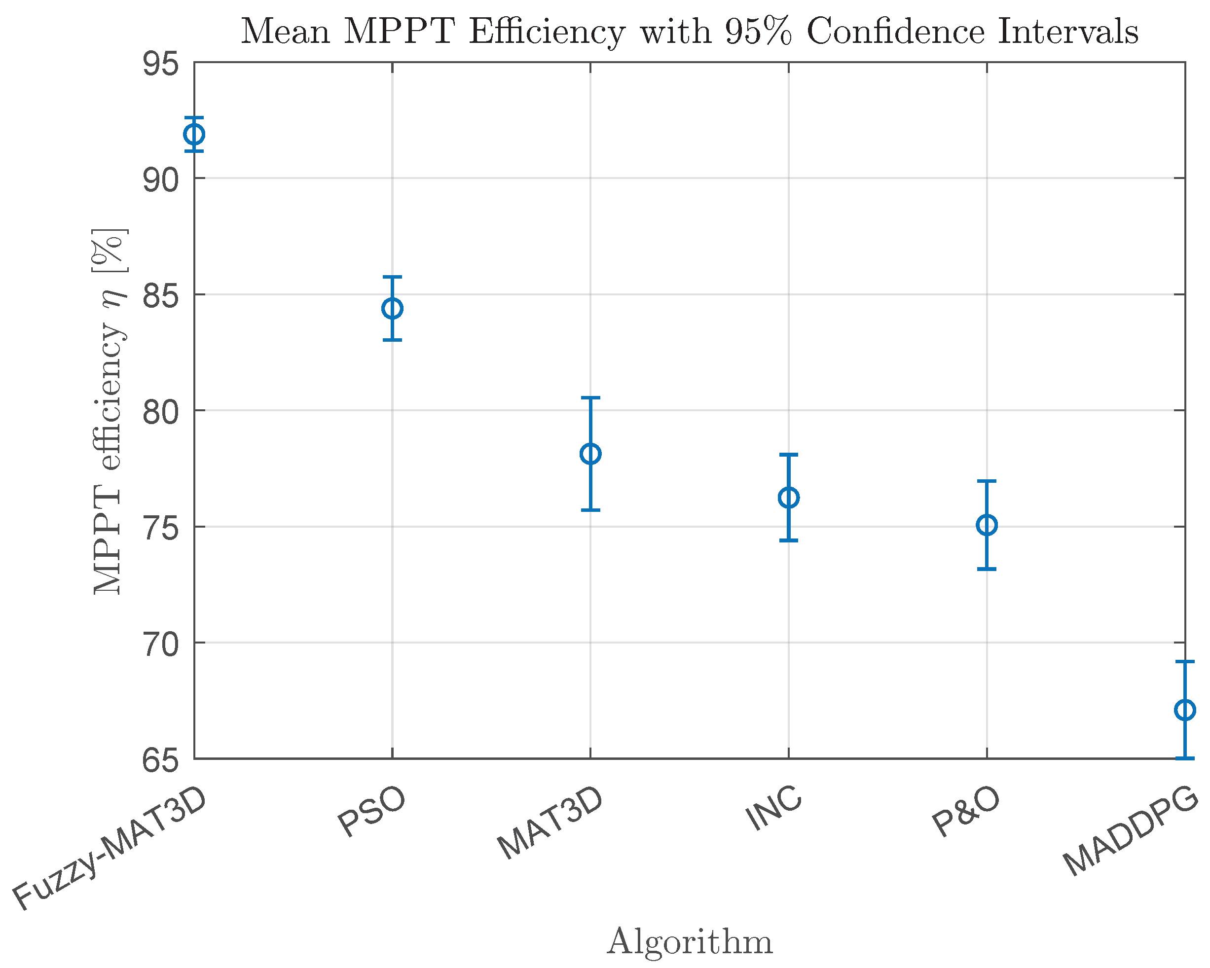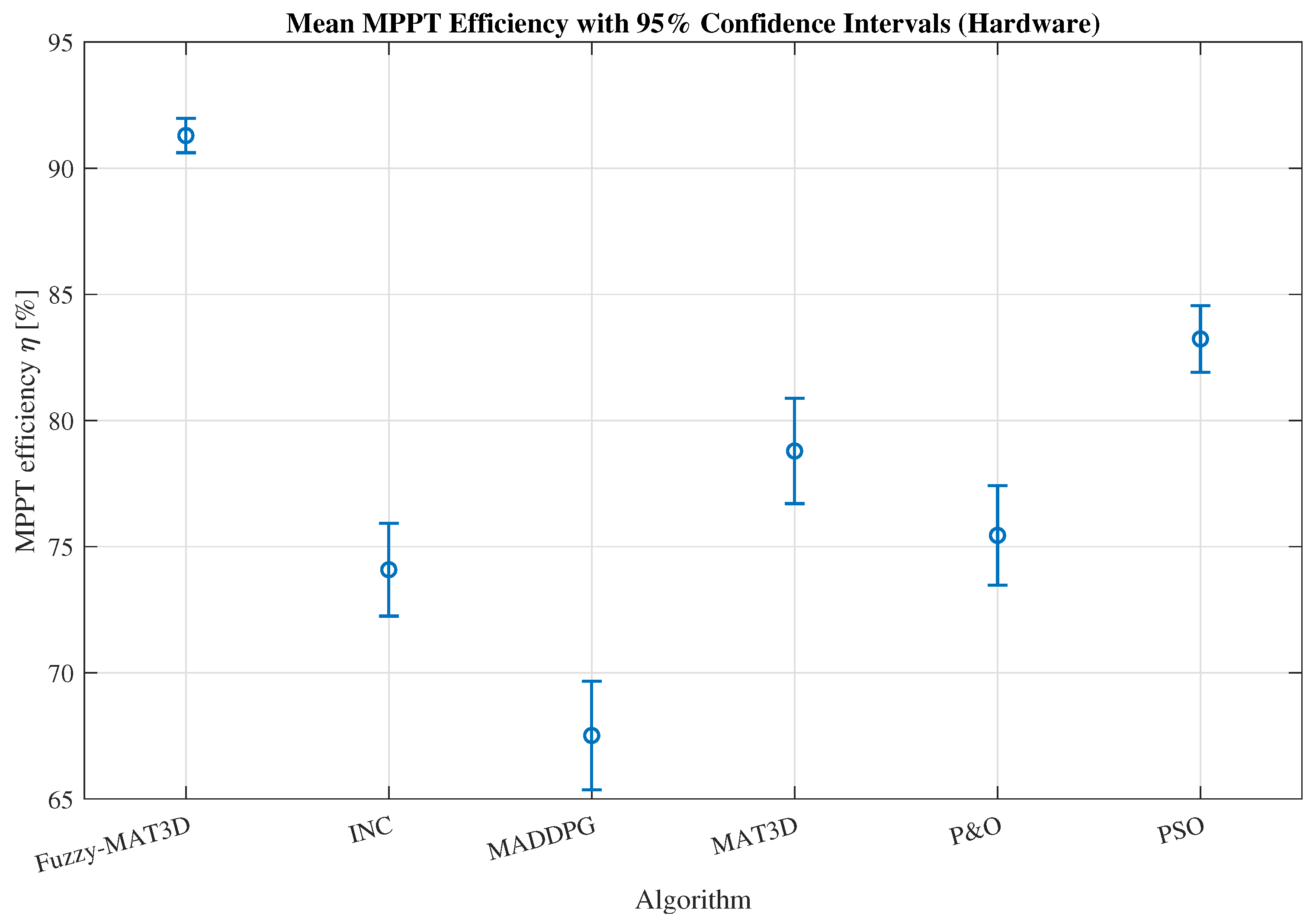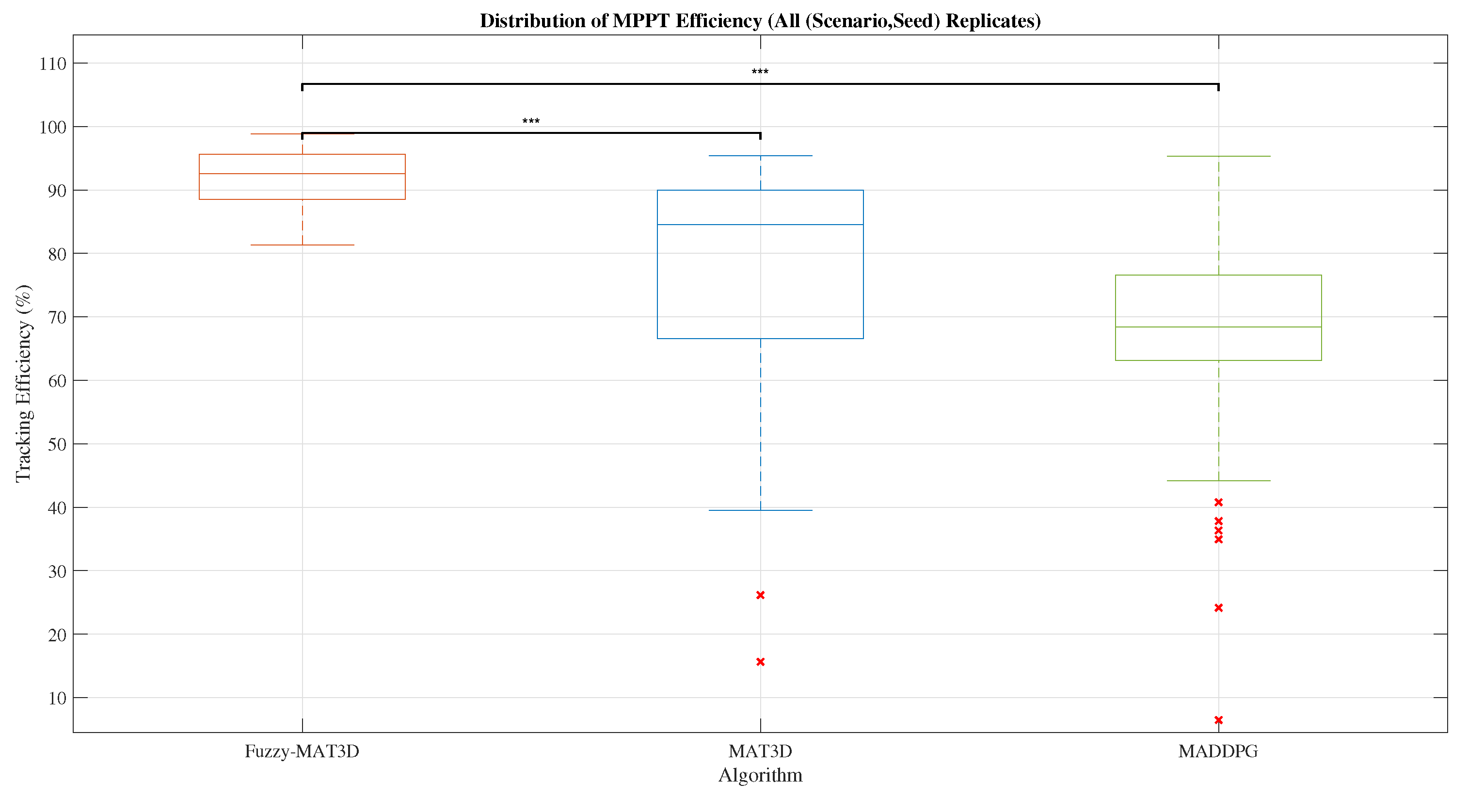 per algorithm), Fuzzy–MAT3D achieves the highest mean MPPT efficiency (