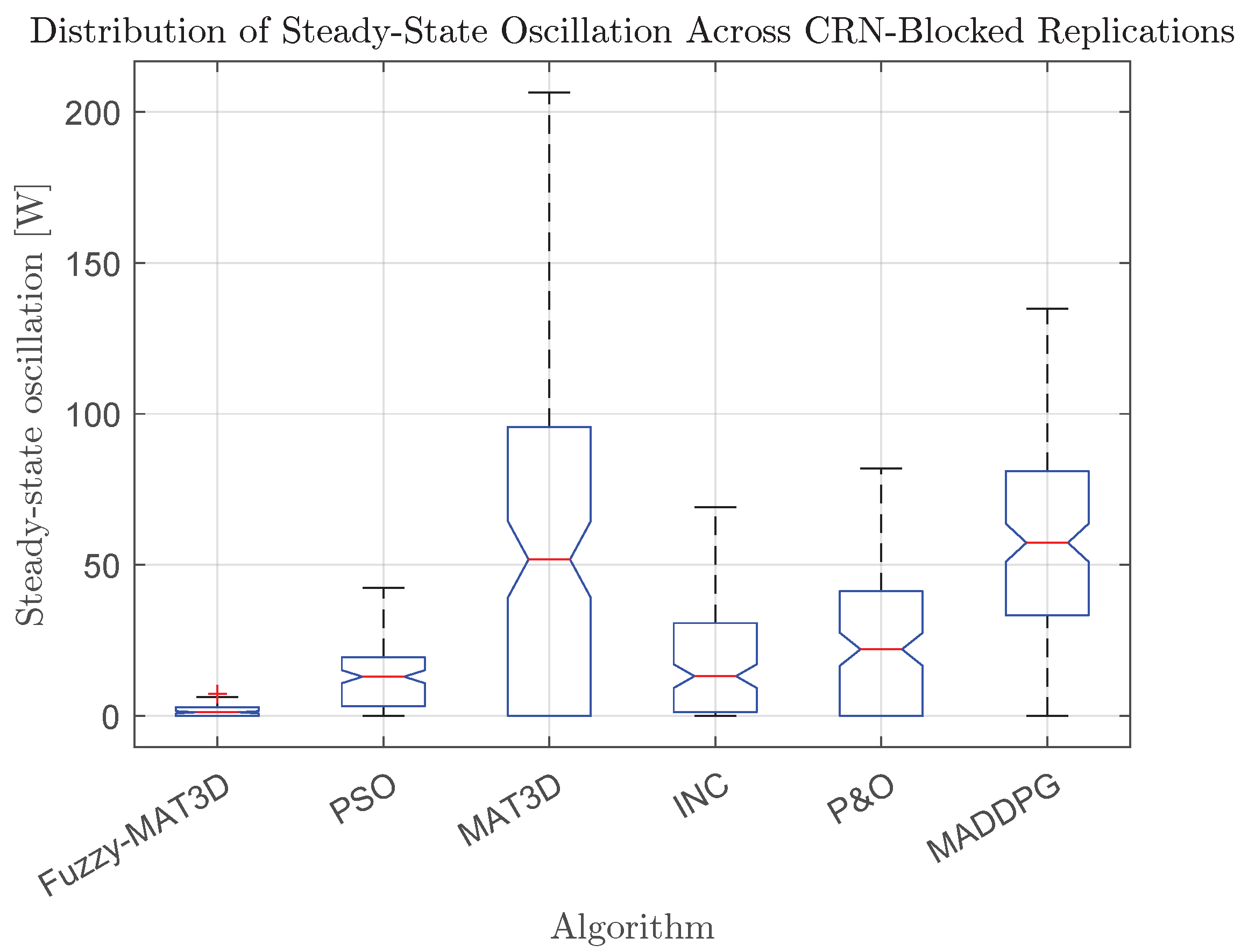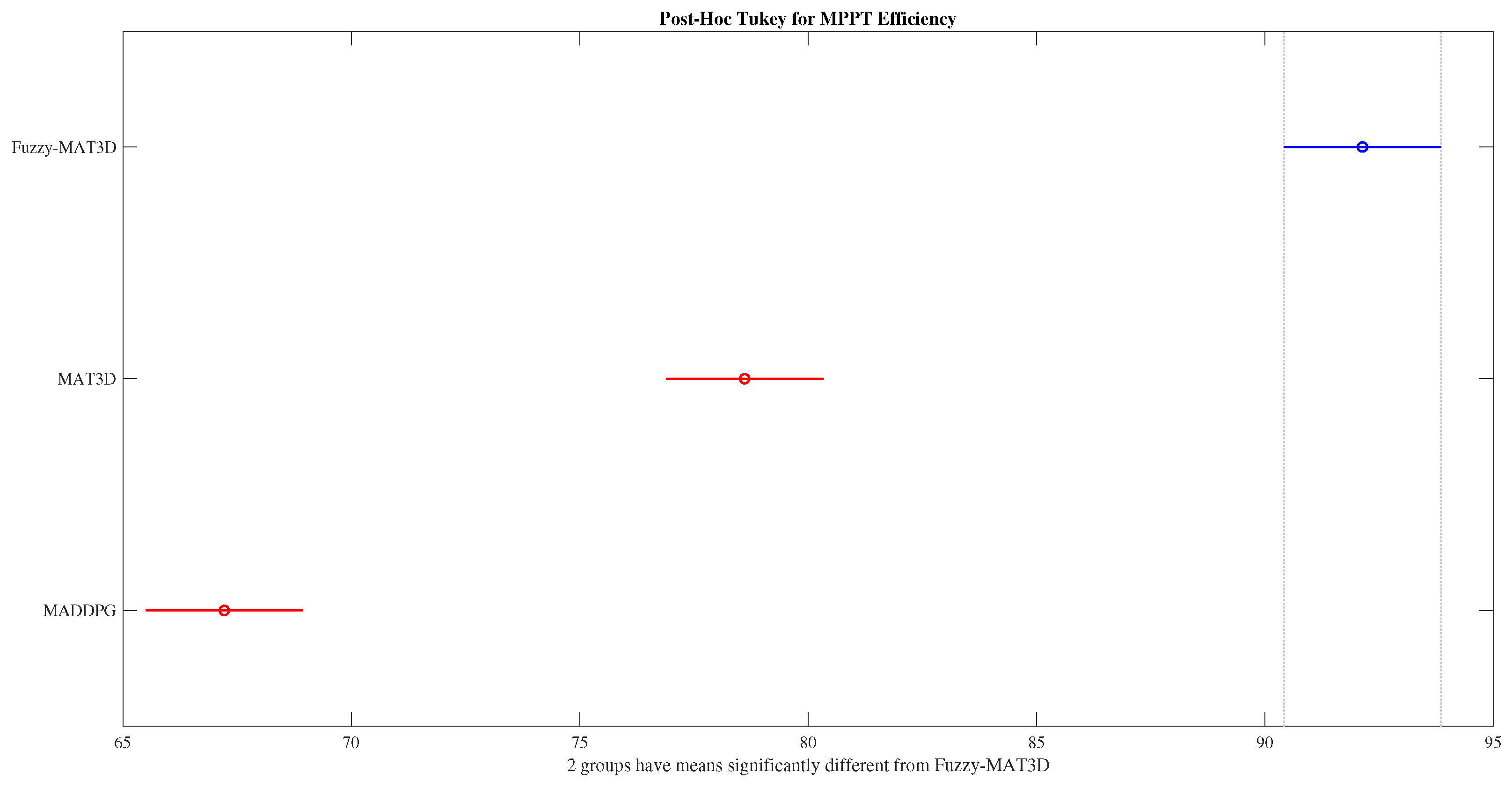 Figure A1 reports Tukey–Kramer confidence intervals for all pairwise algorithmic contrasts. Consistent with the CRN-blocked summaries and directionally aligned with the confirmatory blocked-Dunnett analysis, these intervals place Fuzzy–MAT3D above both MAT3D and MADDPG in mean MPPT efficiency (pairwise CIs against Fuzzy–MAT3D exclude zero), with the largest deficit observed for MADDPG. We therefore treat this panel as supportive context for the superiority ordering rather than an independent inferential claim.