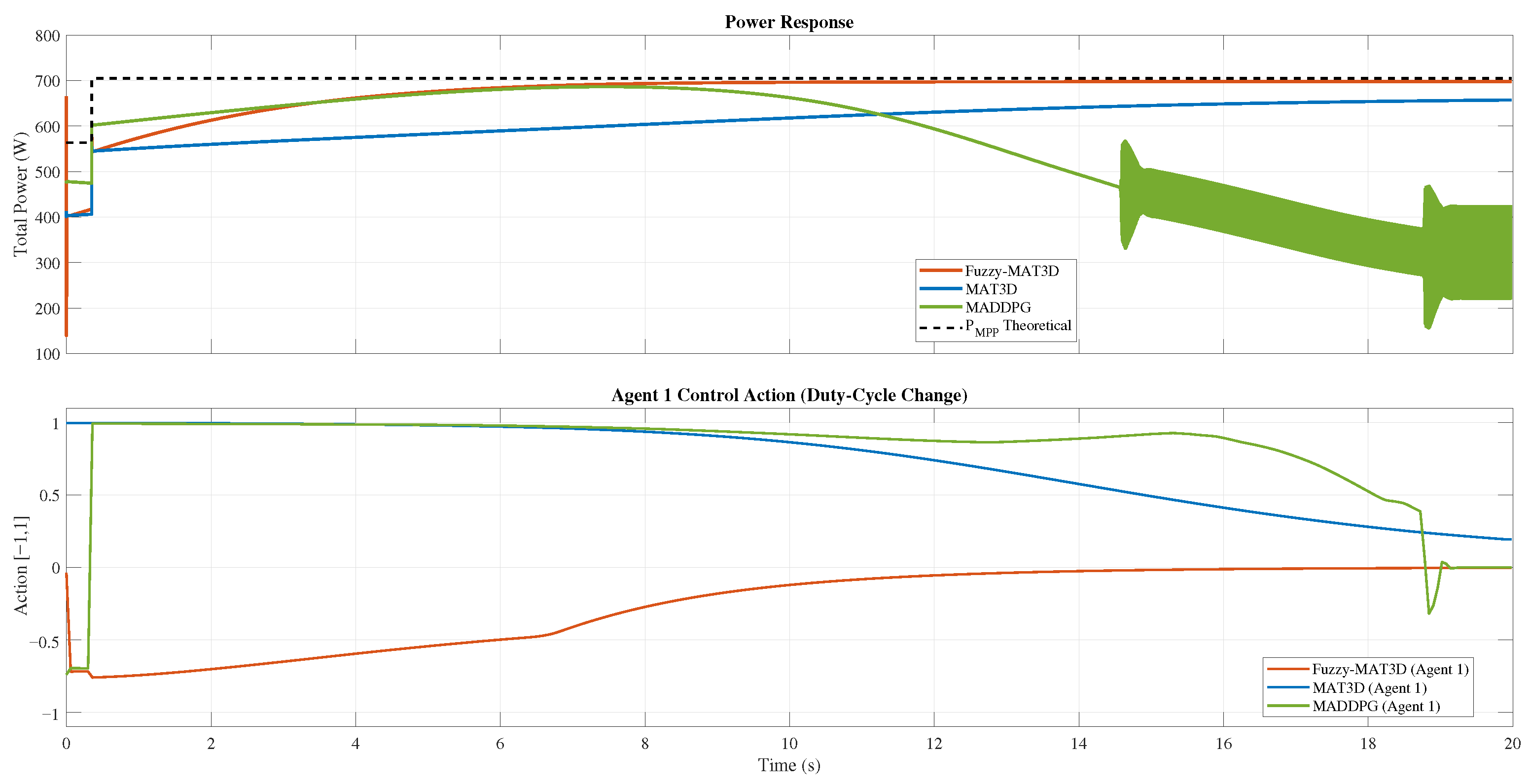 monotonically and maintains it with negligible steady-state jitter, whereas MADDPG overshoots and develops sustained oscillations that depress the average power; MAT3D converges slowly and under-tracks the MPP. The lower panel explains the mechanism: Fuzzy–MAT3D rapidly desaturates the duty cycle and then holds an almost constant command, while the other agents continue exciting the plant—consistent with the ISS-based stability rationale in