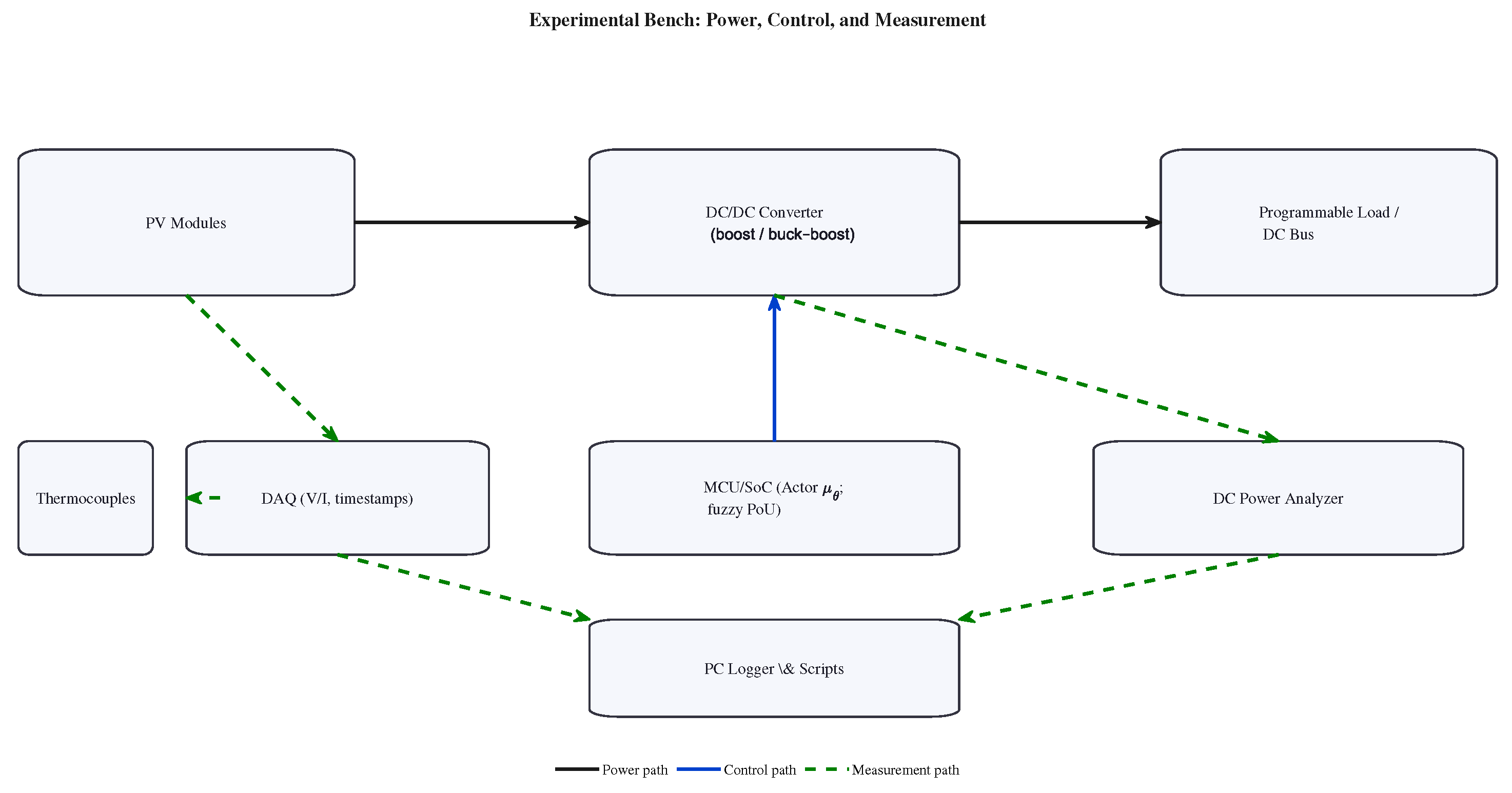 52] motivate structure in actor–critic features; hence, Fuzzy–MAT3D offers a physics-compatible alternative, achieving high yield with low ripple under an identical control period and per-tick compute budget; irradiance is measured and logged for MPP reference and analyses, while classical baselines operate on their standard
