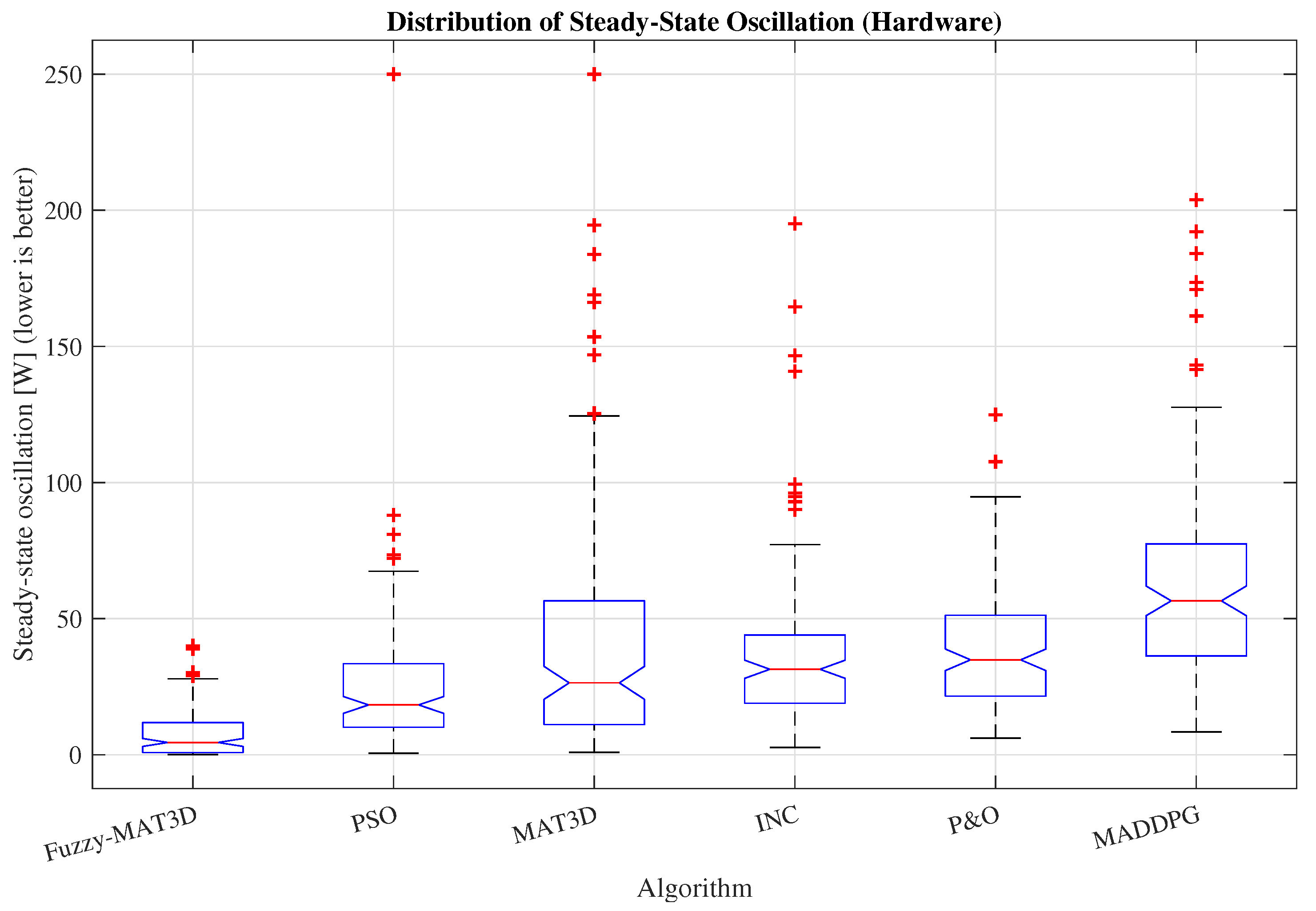 W (MADDPG). Lower jitter not only improves energy capture but also reduces switching stress and thermal cycling in the power stage (