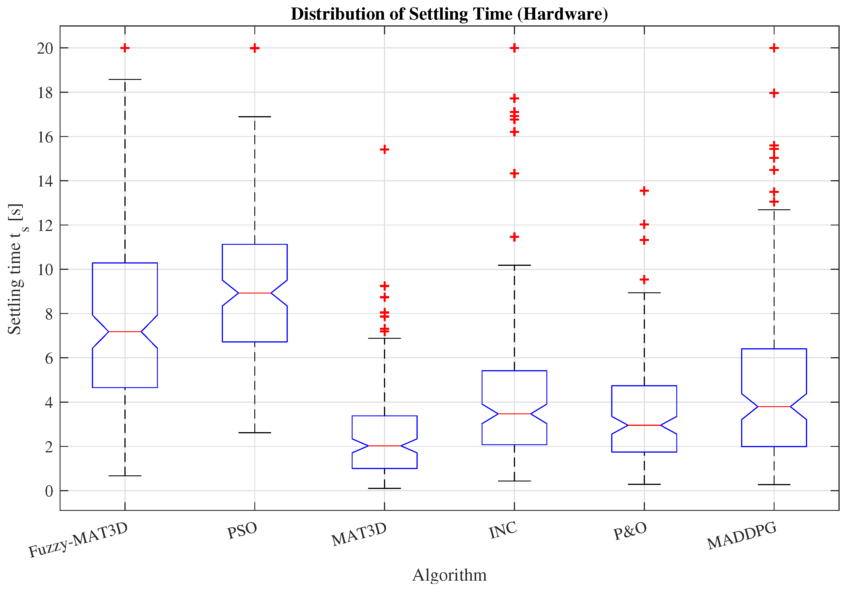Fuzzy–MAT3D is intentionally conservative around abrupt changes; this yields a larger settling time but confers superior stability and decisively better energy tracking. In the aggregate, and for the operational goals of MPPT under partial shading, Fuzzy–MAT3D’s trade-off is the desirable one.