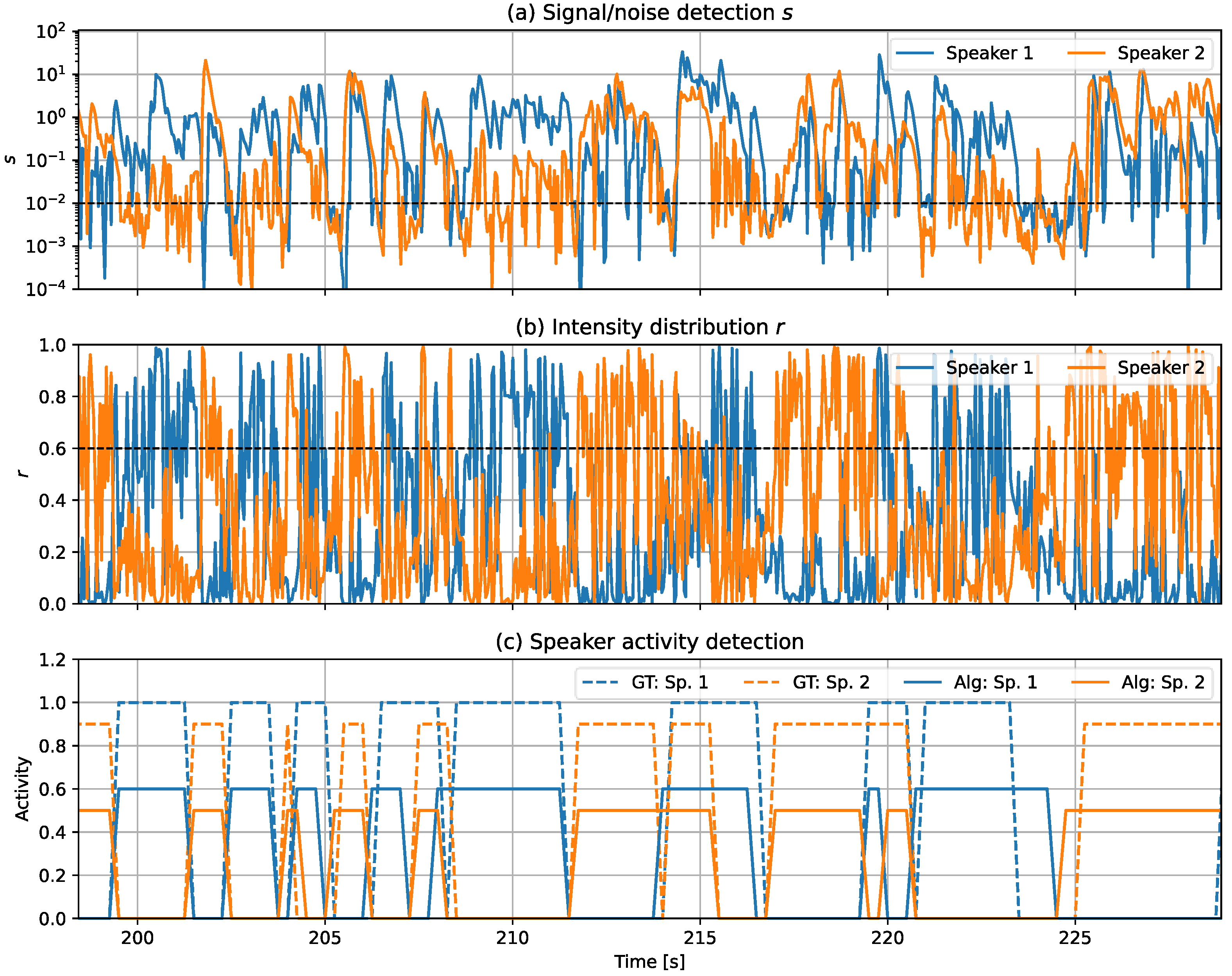 Limitations of the current study include the assumption of approximately stationary speakers and the interview geometry (opposite seating). Recording #2, where one speaker was >2 m away, illustrates sensitivity to noise; better parameter selection or automatic tuning could mitigate this. The case of a speaker moving during the recording may be handled by performing the speaker detection procedure in shorter segments (e.g., 3 s long) and applying a source tracking procedure. Further evaluation of the algorithm is also needed, including test recordings with a larger number of speakers, varying distance between the speakers and the sensor, speech recorded in varied acoustic environments, with different SNR, various noise types, etc. Future work should address moving speakers, more than two concurrent talkers, improved automatic parameter tuning, integration with source separation to support end-to-end ASR, and testing the algorithm in different acoustic conditions, with different speaker configurations.