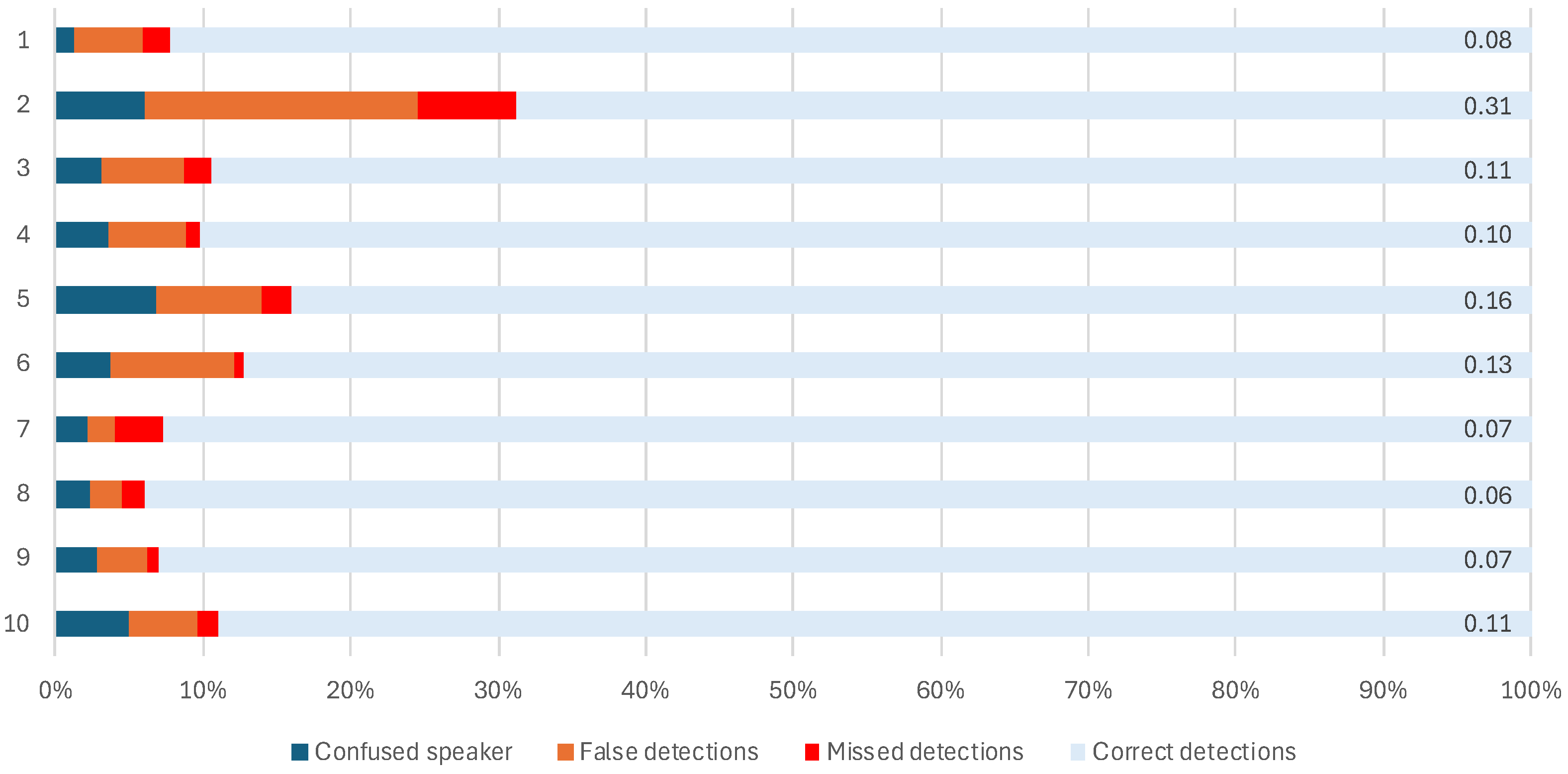 Table 1) and the obtained results. The recording #2 produced a significantly higher DER (0.31) than the other ones. This was the only recording in which one of the speakers was located further from the sensor (more than 2 m away). This resulted in a lower signal-to-noise ratio for this speaker, and consequently, a higher percentage of false detections (19%). However, the FD errors (noise detected as speech) are less critical for speech recognition than the other types of errors, although they increase the risk of hallucinations from the ASR model. The algorithm accuracy in cases like this may be improved by better selection of the threshold values. Automatic calculation of the optimal algorithm parameters is left for future research.
