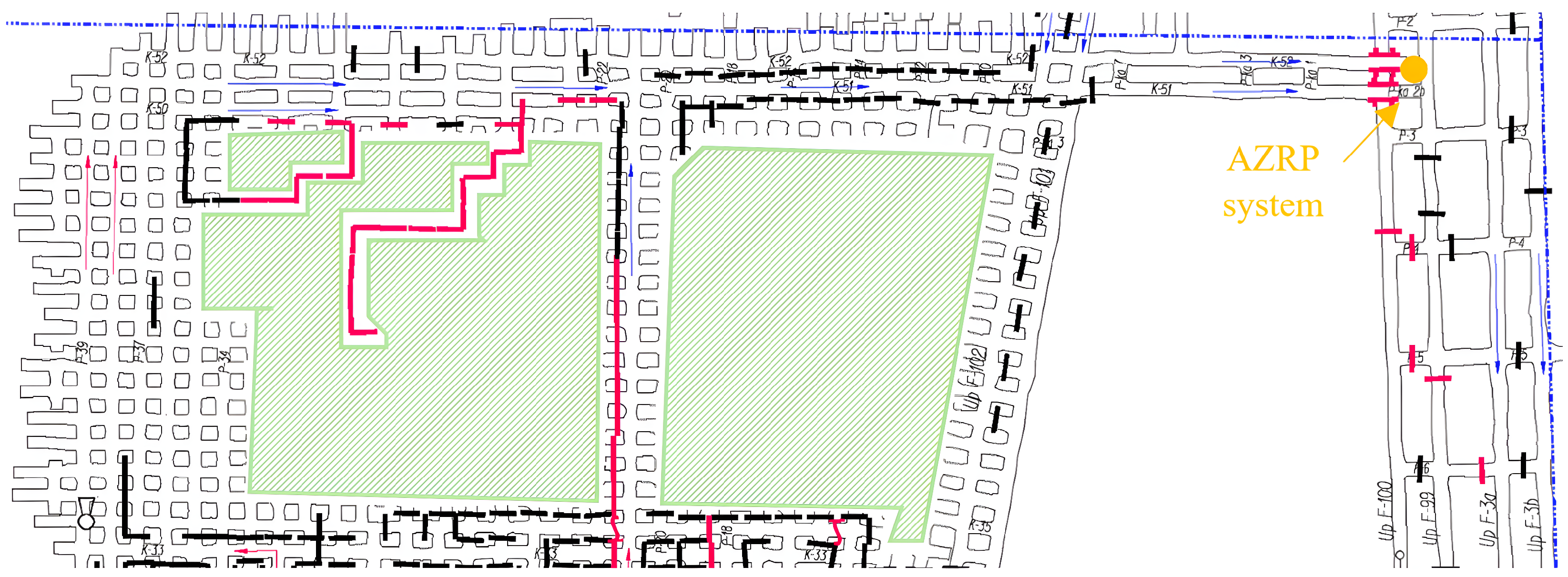 The study was conducted in a mining area where the deposit lies at depths exceeding 860 m below ground level and extends SW-NE, dipping at an angle of 2–5° N to the NE. A flexural feature occurs in the mining area, within which the local inclination of the deposit increases to 28° N, resulting from the influence of tectonic processes. The copper ore deposit is mined using a room-and-pillar system using blasting techniques. The mining process involves cutting the deposit into chambers and strips, while simultaneously establishing technological pillars with basic dimensions ranging from 5 to 15 m to 6–36 m. These pillars, positioned with their longer edges perpendicular to the front line, are designed to support the roof above the working area. Their exact dimensions are determined individually, taking into account local geological and mining conditions, to ensure they function in the post-failure strength phase [32,33,34]. Based on model analyses of the mine’s ventilation network and experience gained at the Polkowice–Sieroszowice mine, the minimum airflow rate for mining operations in the selected study area was determined to be 3000 m3/min. Based on model analyses of the mine ventilation network and experience from the Polkowice–Sieroszowice mine, the minimum air flow capacity for mining operations in the selected research area was set at 3000 m3/min. Average pillar dimensions in 2014: 7 × 8 m and 8 × 9 m in 2017. The average distance from the face to the measurement point in 2014 was 1684.75 m, and in 2017 it was 2026.30 m. The air velocity at the sensor installation site is approx. 3.12 m/s, and the cross-section of the excavation is 16 m2. The total air flow (3000 m3/s) flows in three air streams—from the face to the working areas: 1100, 1000, and 900 m3/s, respectively, with a speed in the face area of approx. 1.15 m/s. A gaseous hazard, hydrogen sulfide (H2S), was detected in the analyzed mining area, posing a significant risk to employee safety due to its toxicity. Figure 1 shows an overview map of mine workings located in the area of the mining division next to which continuous measurements of hydrogen sulfide concentration in mine air are carried out. The map includes the layout of the main workings, the directions of ventilation and the location of the measurement point where changes in the concentration of this gas are recorded.