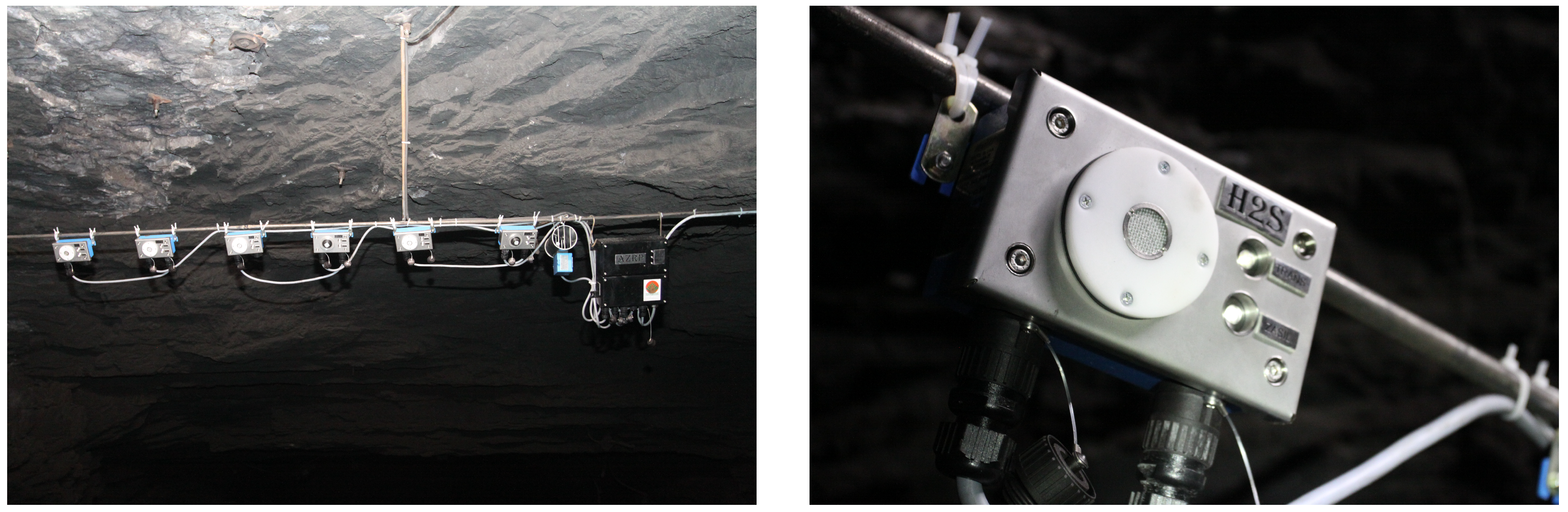 Underground mines have always been associated with various types of hazards to the health and lives of miners [1,2,3]. Working underground carries with it not only the risk of mechanical accidents, such as collisions with machinery, but also natural hazards—including particularly dangerous gas hazards [4,5]. Various gases can accumulate in mine workings, such as methane (CH4), which is highly explosive, carbon monoxide (CO), which is toxic and can lead to asphyxiation, or nitrogen oxides (NOx), which cause irritation to the respiratory system [6,7,8,9]. As reported by Tan et al. [10], one of the most dangerous yet naturally occurring gases in mines is hydrogen sulfide (H2S). This gas in underground mines poses a serious threat. Over the past several years, hydrogen sulfide also poses a major threat to underground crews in Polish copper ore mines. According to current regulations, the permissible value of this gas must not exceed a volumetric concentration of 0.0007% (7 ppm) [11]. It occurs mainly in the lower anhydrite layers of the first Zechstein cyclothem, where it forms, among other processes, as a result of microbial sulfate reduction [12,13]. Due to natural fracturing of the rock mass and discontinuities caused by mining, hydrogen sulfide can migrate into mine workings. Its presence in the mines of the Legnica-Glogów Copper District (LGOM) was first more extensively documented around 2010 and has since been recognized as a significant hazard to working conditions and the underground environment [14,15].