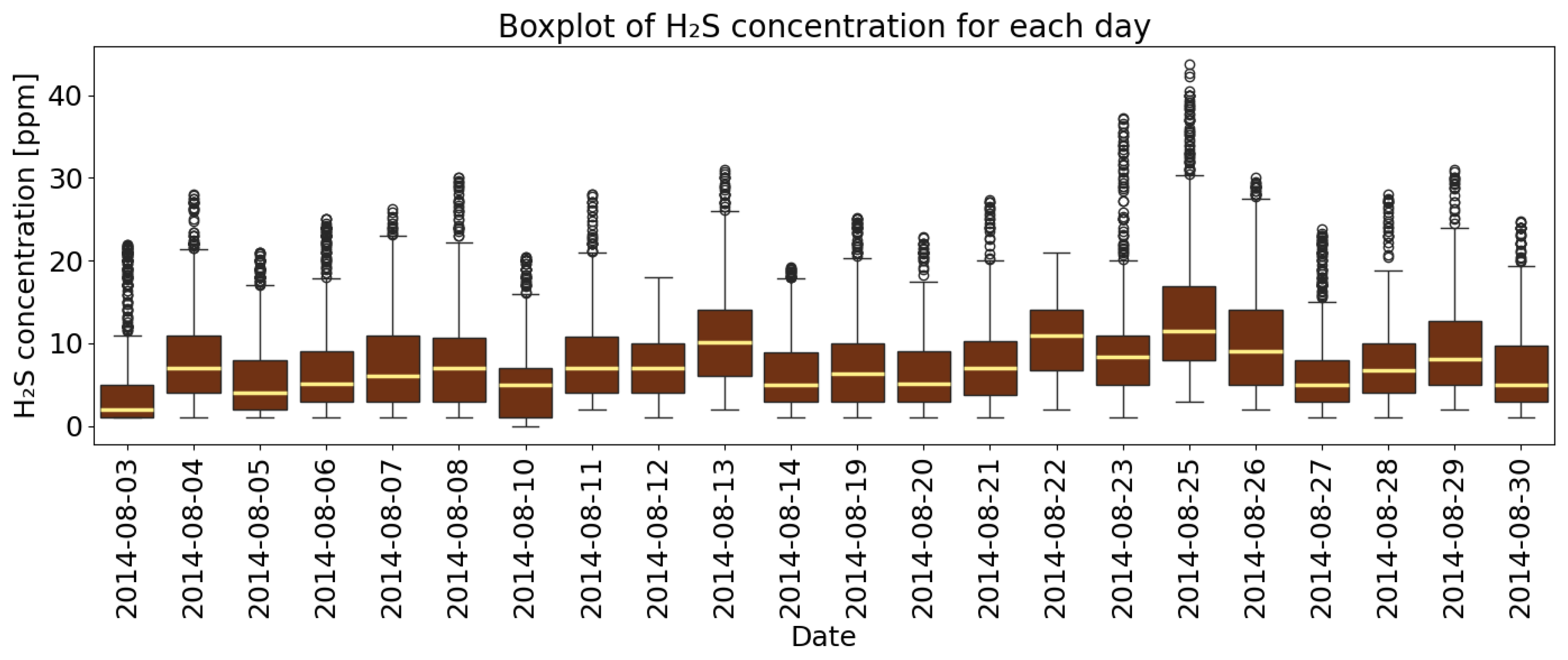 In August 2014 (Figure 3), hydrogen sulfide (H2S) concentrations showed considerable variability from day to day during the month. The box plot shows that median concentrations generally remained in the range of about 4 to 8 ppm, but on many days there were numerous outliers as high as 40 ppm. Particularly high and unstable H2S levels were recorded on 23–26 August, which may indicate episodes of increased pollutant emissions. On the other days of the month, the distribution of concentrations was more stable and the variability was lower.