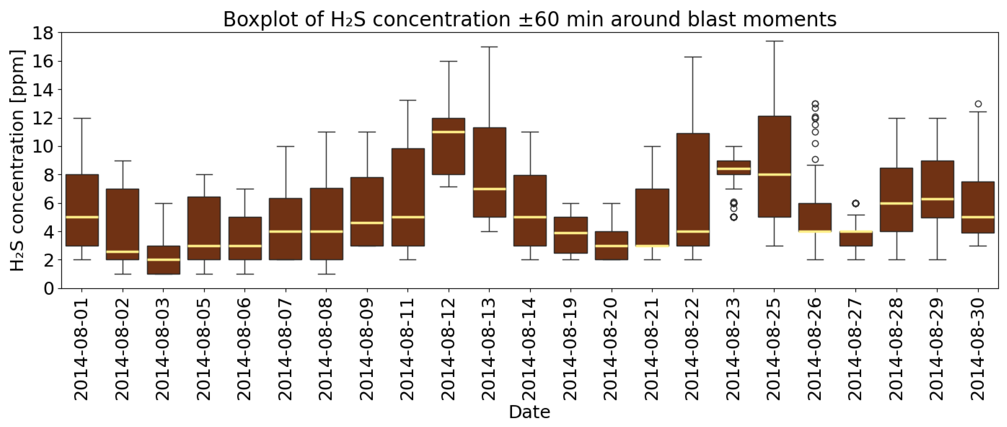 Figure 4. Boxplot of H2S concentrations for the analyzed period ± 60 min after the blast (August 2014).