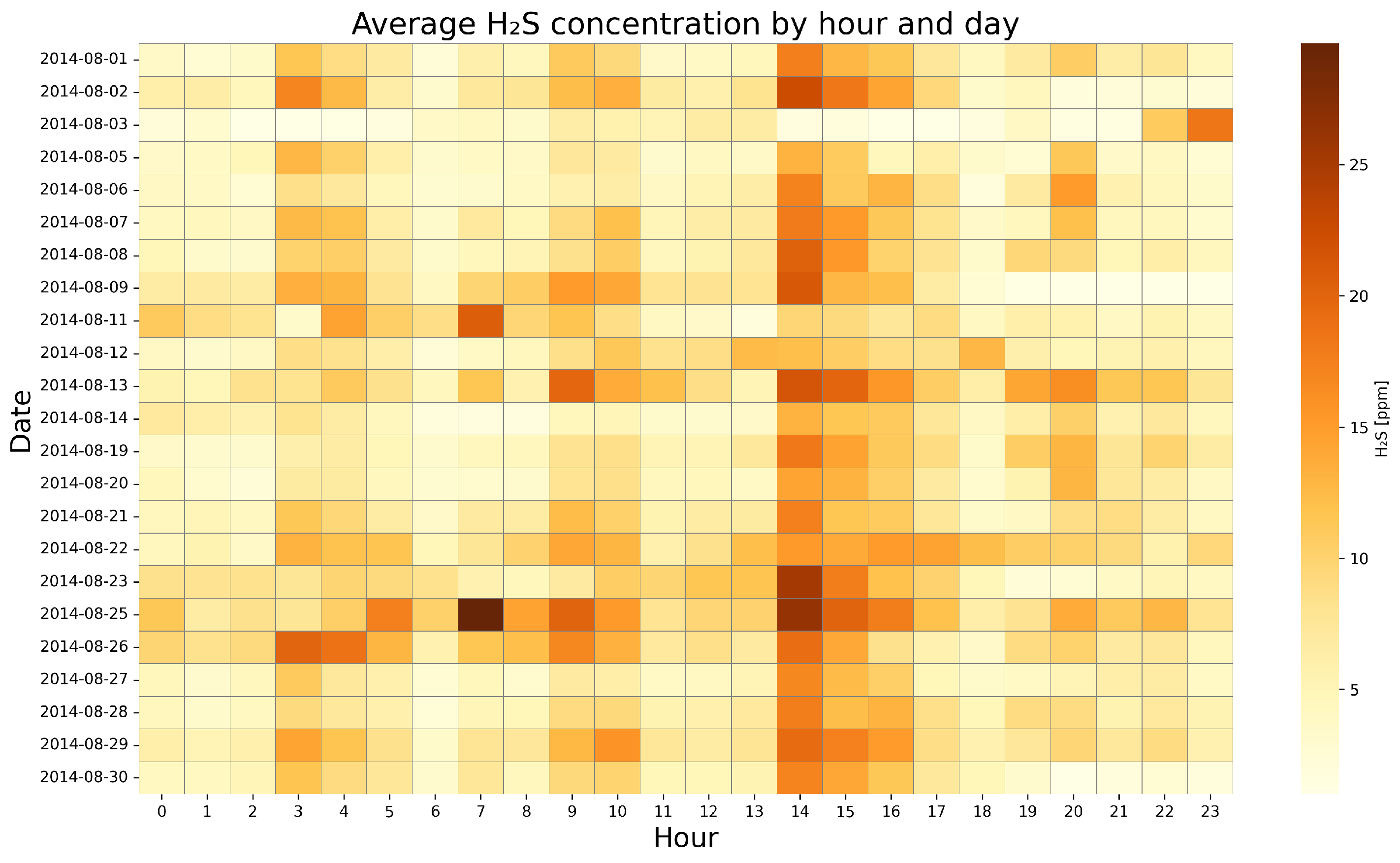Figure 7 shows a heat map of hydrogen sulfide concentrations for the analyzed period of 2014, broken down by measurement day.