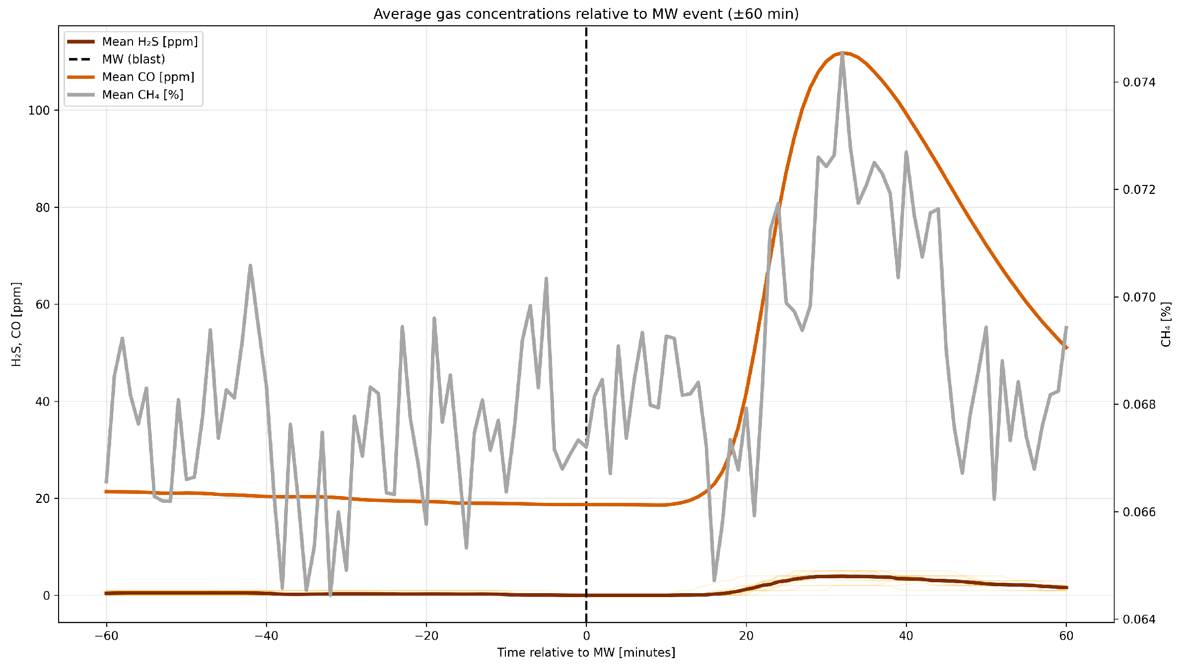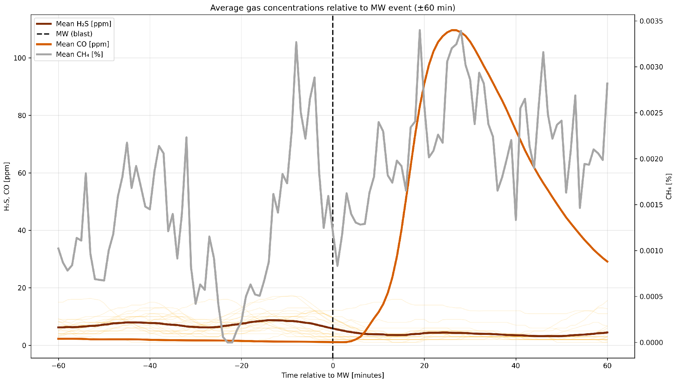 In 2014, relatively high concentrations of H2S were observed before the moment of blasting (time < 0), remaining in the range of 6–9 ppm. This indicates the presence of significant amounts of hydrogen sulfide in the air even before the blast, which may be the result of the influence of other geological and mining factors in the department. Immediately after the moment of the blast (time 0), there is a marked decrease in the concentration of H2S to a level of about 3–4 ppm. In the following minutes after the blast, the concentration of H2S remains at a lower level, and then a gradual increase is observed, reaching 4–5 ppm again around 60 min after the blast. The release of hydrogen sulfide probably already occurs immediately after the blast, while the observed delay is a result of the time required for the gas to flow to the sensors (AZRP).