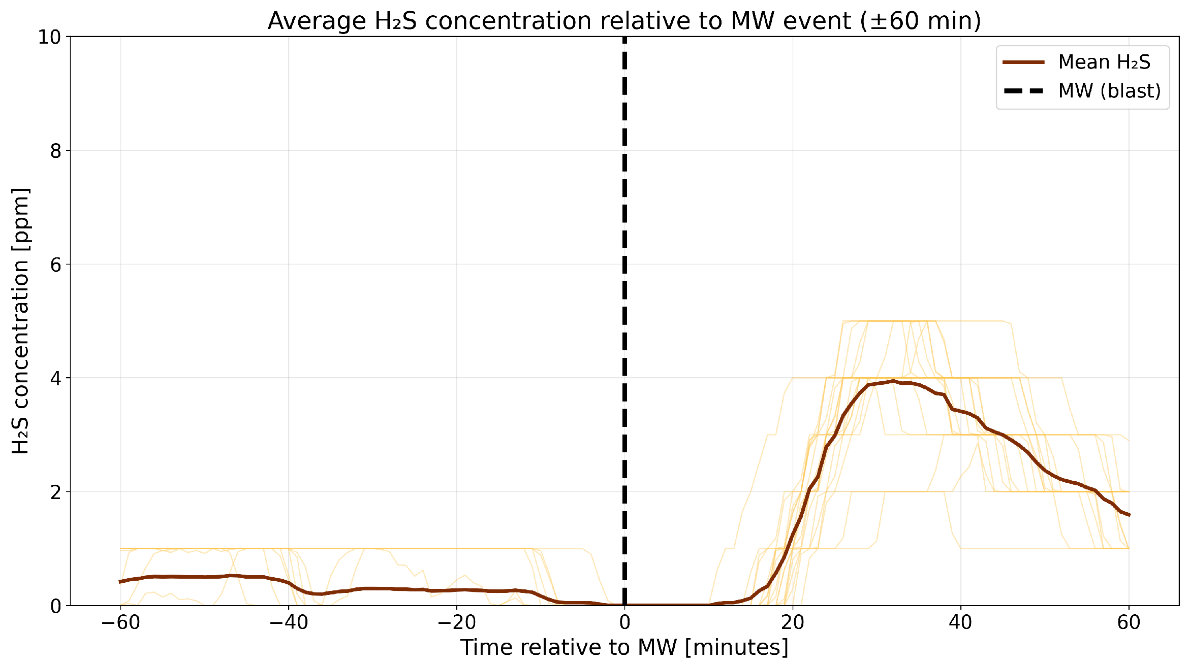 An analysis was carried out to determine the average time of increase in hydrogen sulfide (H2S) concentration in mine air after blasting during the analyzed periods. Measured data of H2S concentration were analyzed at a frequency of 1 min within a time window of 60 min after each blast. The change from analyzing seconds to minutes of data in the context of analyzing daily data from a month is intended to simplify the analytical process.
