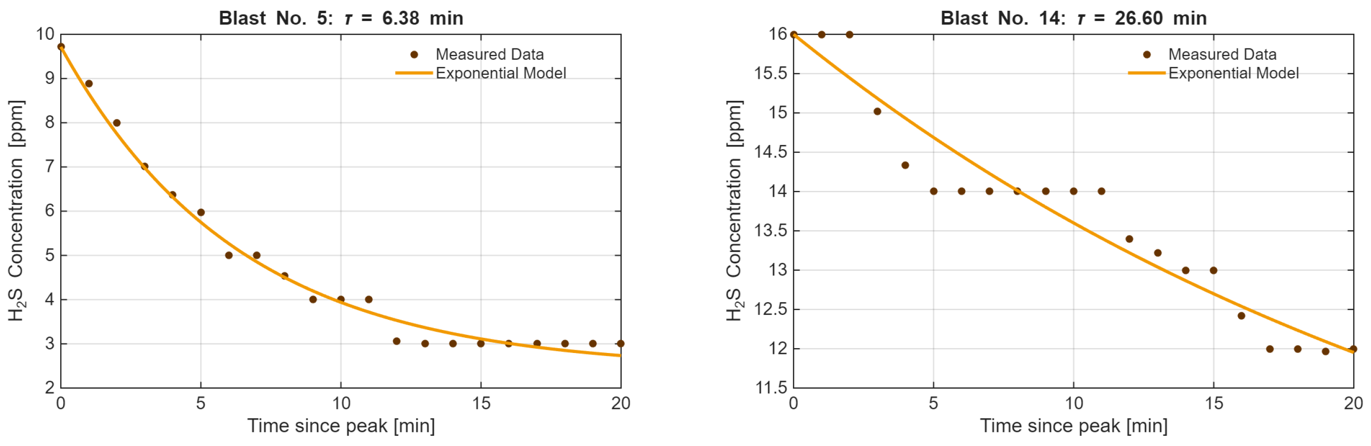Figure 16. Comparison of H 2 S concentration decay models illustrating different ventilation efficiencies observed in the study. Left: Rapid decay ( τ 6 min). Right: Slower decay ( τ 26 min). The orange line represents the fitted exponential model, while dots represent measured data.