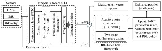 At the measurement level, the proposed positioning system is set by combining raw sensor measurements and temporally encoded features which are extracted from sequential sensor measurement data for effective context-aware learning. The proposed system primarily utilizes GPS, IMU, and wheel odometry sensors. However, the GPS measurements are treated as noisy and potentially unreliable observations rather than ground-truth positions, especially under NLOS and multipath conditions. The proposed DRL-based IAKF is designed to adaptively adjust the noise covariances and fuse these heterogeneous measurements to improve robustness and reduce long-term error drift. Although LiDAR can further enhance spatial accuracy, its heavy computational and resource requirements limit its practicality for resource-constrained positioning systems. The TE is implemented using a fully convolutional network-based context-aware layer and a state estimation layer composed of CNN and gated recurrent unit (GRU) modules to extract representative spatiotemporal features. A pre-processing stage is conducted using dynamic time warping to align sampling rates and extract the estimated position.