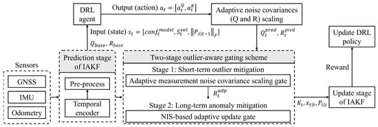 At the model-learning level, the DRL agent adaptively scales the noise covariances by estimating model and measurement uncertainties through the accumulated reward mechanism at each time step. Furthermore, the two-stage outlier-aware gating process is employed to address measurement uncertainty for the adaptive IAKF update. Subsequently, the parameters of the IAKF and the DRL policy are updated, and the final positions in the north and east directions are estimated.