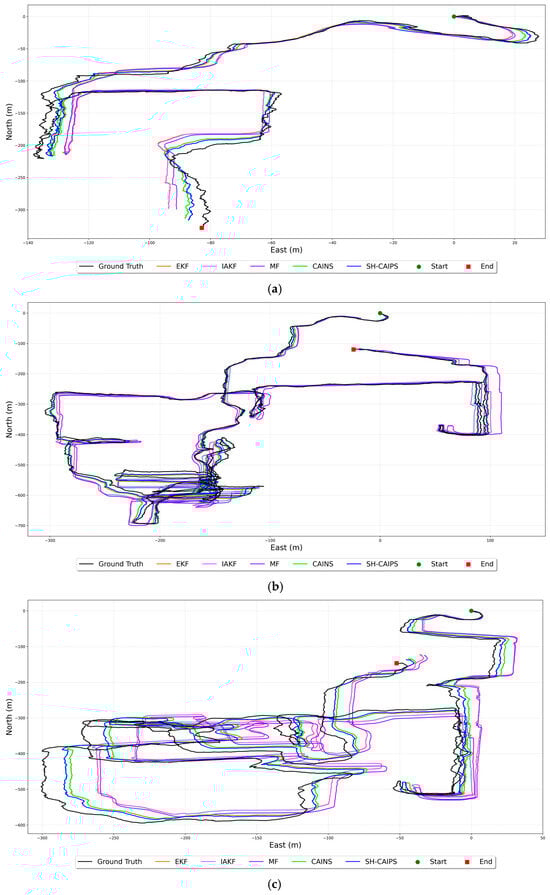 Trajectory comparison of proposed SH-CAIPS across three distinct datasets: (a) dataset 1, (b) dataset 2, and (c) dataset 3.
