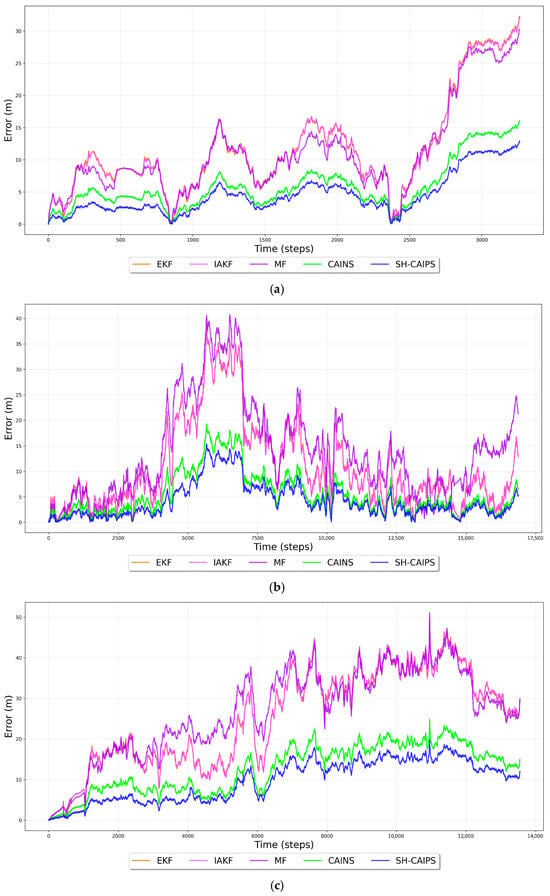 Error drift comparison of proposed SH-CAIPS across three distinct datasets: (a) dataset 1, (b) dataset 2, and (c) dataset 3.