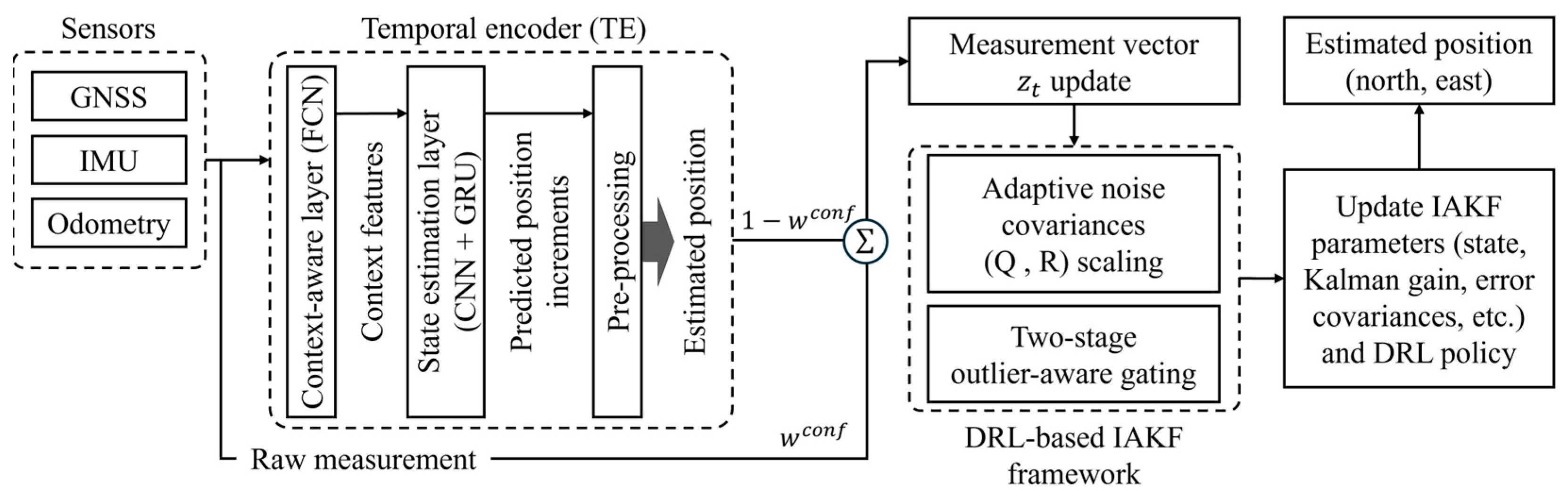 - An integrated SH-CAIPS architecture that couples DRL-based IAKF with outlier mitigation, achieving robust and accurate positioning using cost-effective sensors such as GPS, IMU, and wheel odometry without environment-specific prior knowledge.