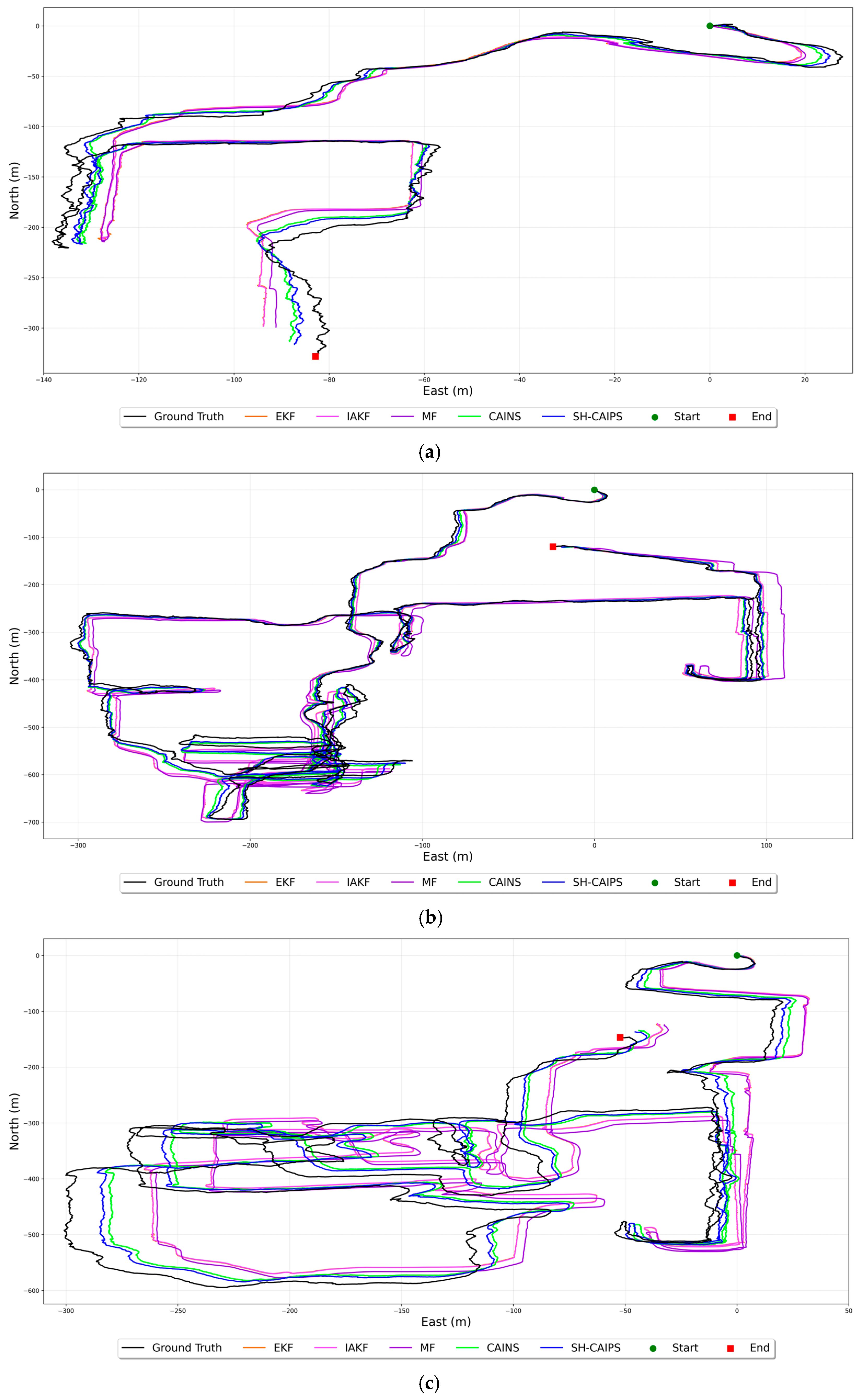 - Shen, C.; Zhang, Y.; Guo, X.; Chen, X.; Cao, H.; Tang, J.; Li, J.; Liu, J. Seamless GPS/Inertial navigation system based on self-learning square-root cubature Kalman filter. IEEE Trans. Ind. Electron. 2021, 68, 499–508. [Google Scholar] [CrossRef]