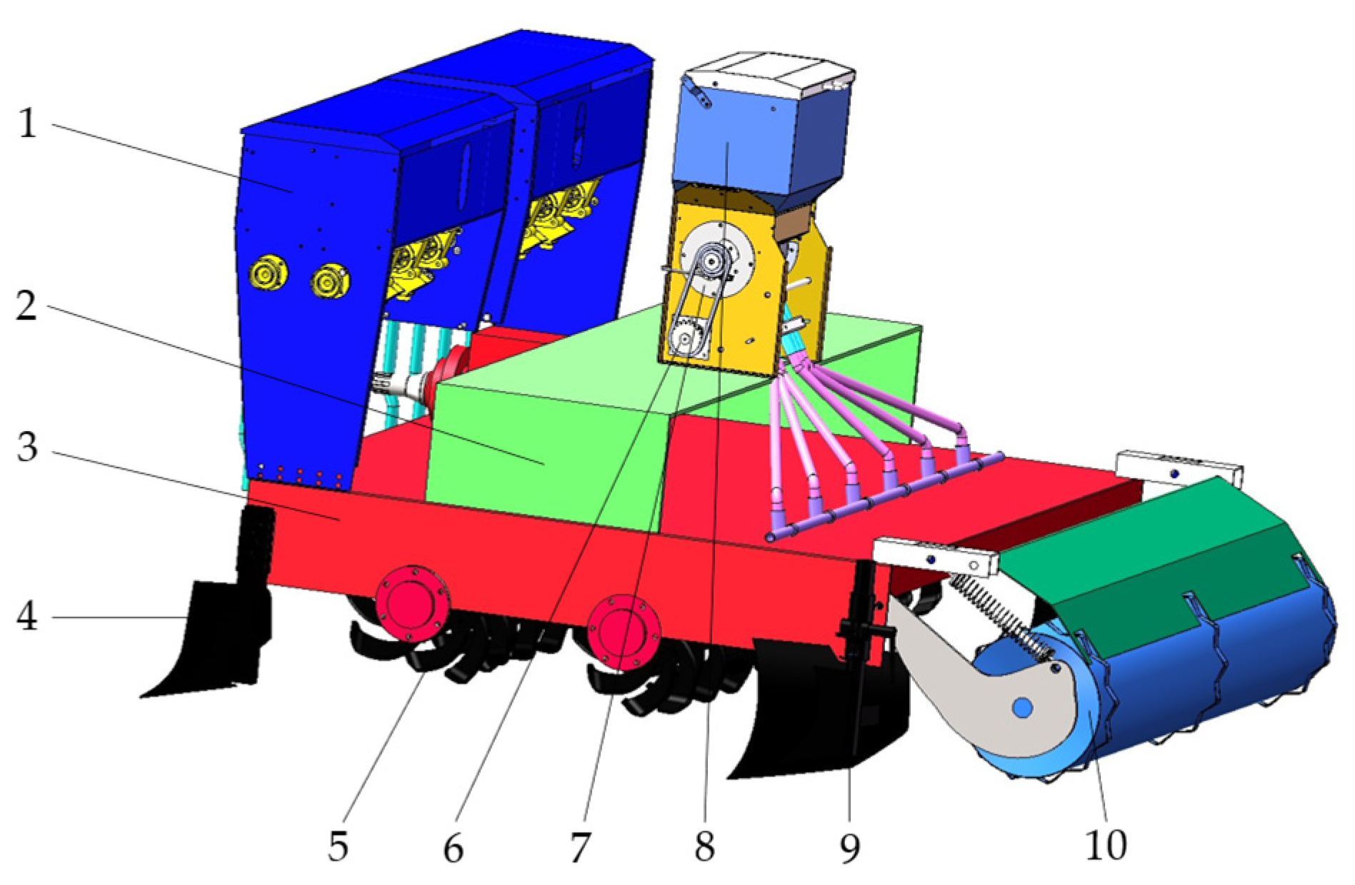 The rapeseed roller-type precision centralized seed metering device based on the Bezier curve designed in this study is installed on the dual-axis rotary tillage precision seeder shown in Figure 1. Its main structures include a rotary tillage device, a seeding device, a fertilization device, a compaction device, and a power transmission device.