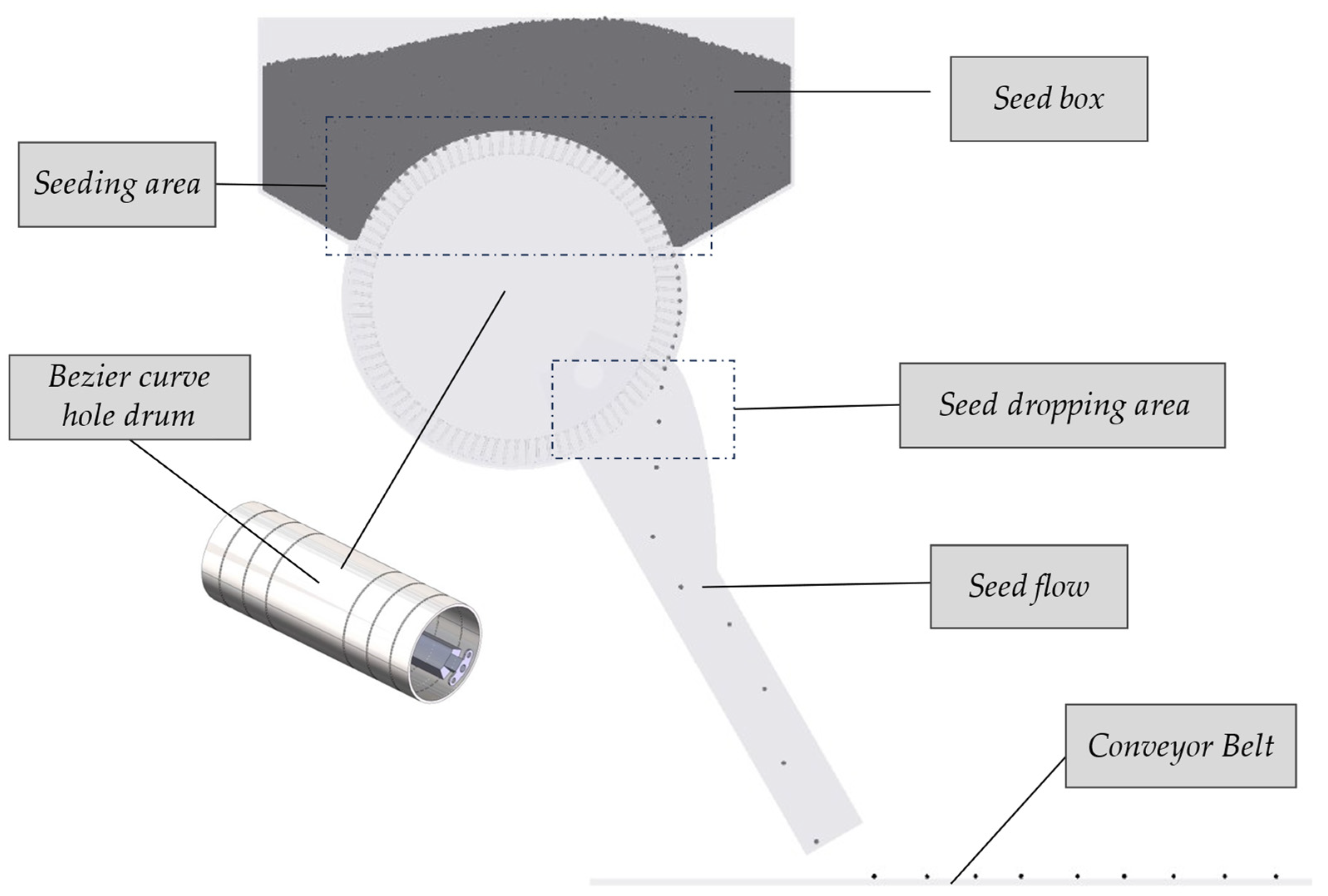 The structure of the seed metering device is shown in Figure 2. As presented in Figure 2a, it mainly consists of a seed box, a seed metering roller, an air-blowing plate, a rotating shaft, a roller cover, a seed-dropping pipe, and other components. The seed metering roller is provided with several circles of seed-filling holes, which include Bezier curve holes and conical air inlets. The profile of the Bezier curve holes is constructed based on cubic Bezier curves, and the cross-sectional curvature is dynamically adjusted via the coordinates of control points. The conical air inlets at the bottom of the holes (shown in Figure 2b,c) are connected to the air-blowing plate. As shown in Figure 2b, the positive-pressure airflow inside the air-blowing plate acts on the bottom of the holes through the air inlets, and seed dropping is completed with the combination of the seeds’ own weight.
