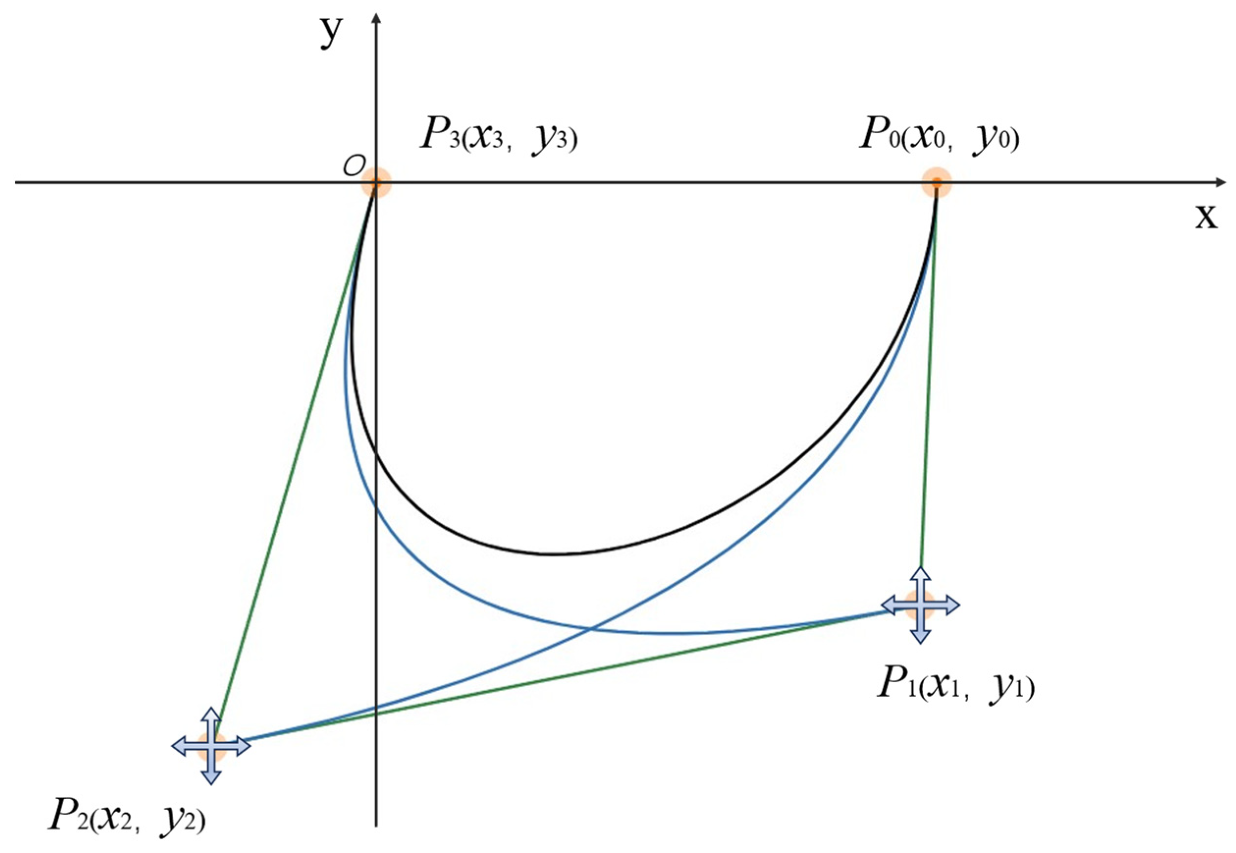 where P 0 ,   P 1 ,   P 2 ,   a n d   P 3 represent the vertex coordinates of the Bezier control polygon; B i , 3 t (where i =   0 ,   1 ,   2 ,   3 ) represents the cubic Bezier basis functions; and t represents the abscissa value of the point on the curve, with 0 t 1 .