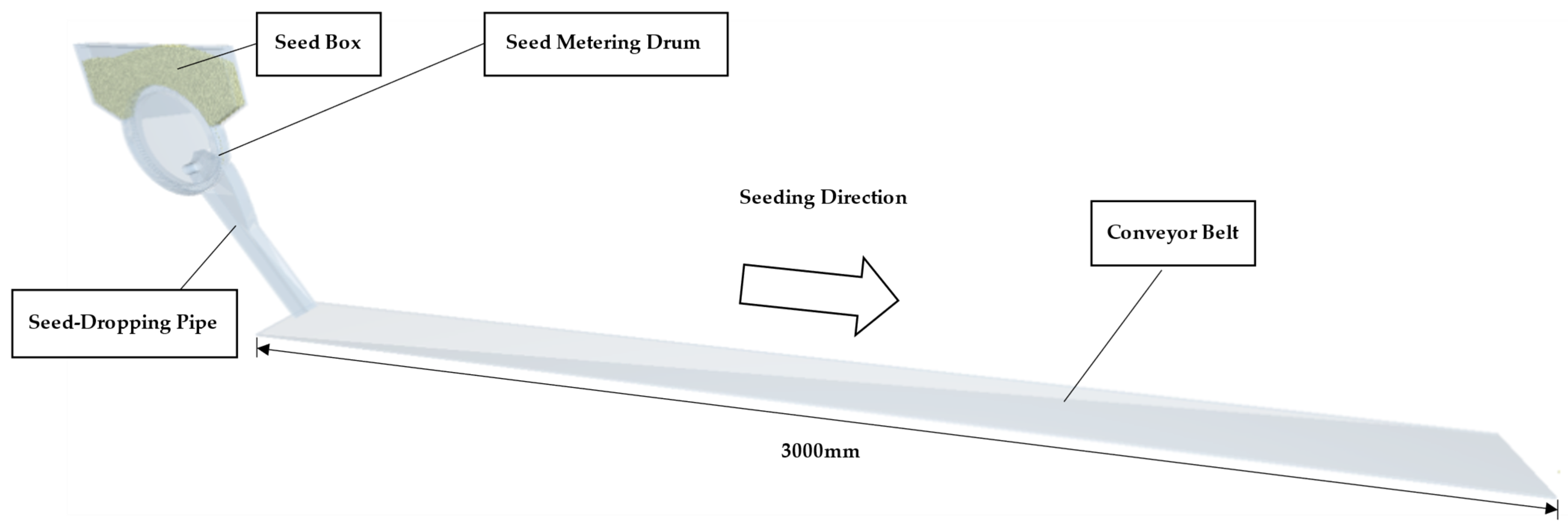 In the simulation, the seed particles are simplified to a spherical model with a diameter of 2 mm. The size of the seed model follows a normal distribution, with a standard deviation of 0.05 mm [26]. The Hertz–Mindlin non-slip contact model is adopted for the contact between seeds, and between seeds and the seed metering device model. The material of the seed metering device model is ABS engineering plastic, and the dimensions of the conveyor belt are 3000 mm × 100 mm × 3 mm [27]. The finally established discrete element model of the seeding test bench is shown in Figure 10. The simulation parameters are listed in Table 3 [28].