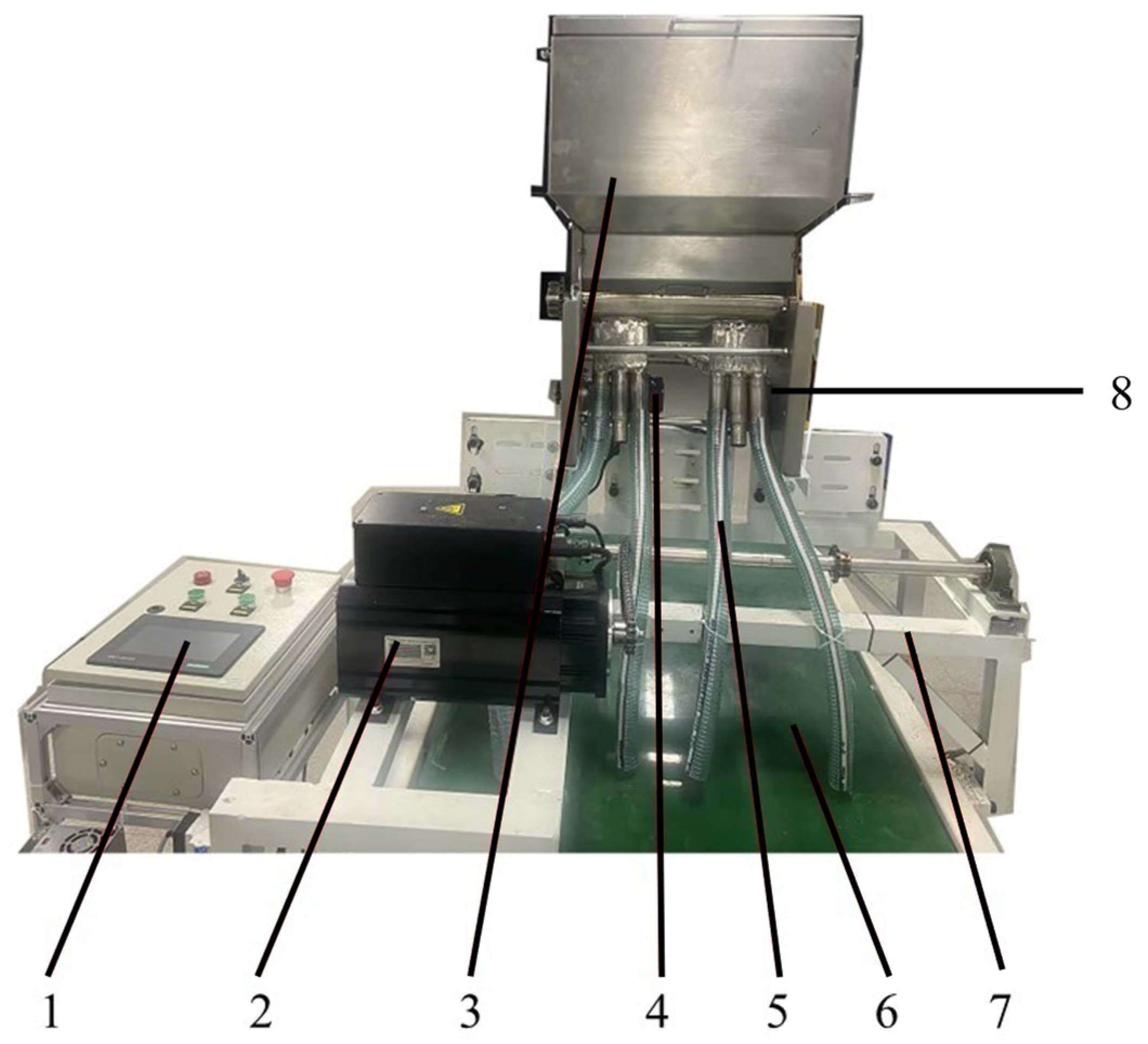 To verify the accuracy of the simulation and the actual seeding effect under bench test conditions, a bench test on the seeding performance of a 6-row seed metering device was conducted on the seed metering device test bench in the laboratory of Hubei Provincial Agricultural Machinery Appraisal Station. The main test devices included a prototype of the rapeseed roller-type precision cluster metering device with Bezier curve-based cell holes, a servo motor, a centrifugal fan (connected to the high-pressure chamber of the seed metering device via an air pipe), an electronic balance, and a test platform for seed metering device performance detection. For the test, Deyouza 988 rapeseed seeds—widely cultivated in the middle and lower reaches of the Yangtze River—were selected. The seed metering device test setup is shown in Figure 11.