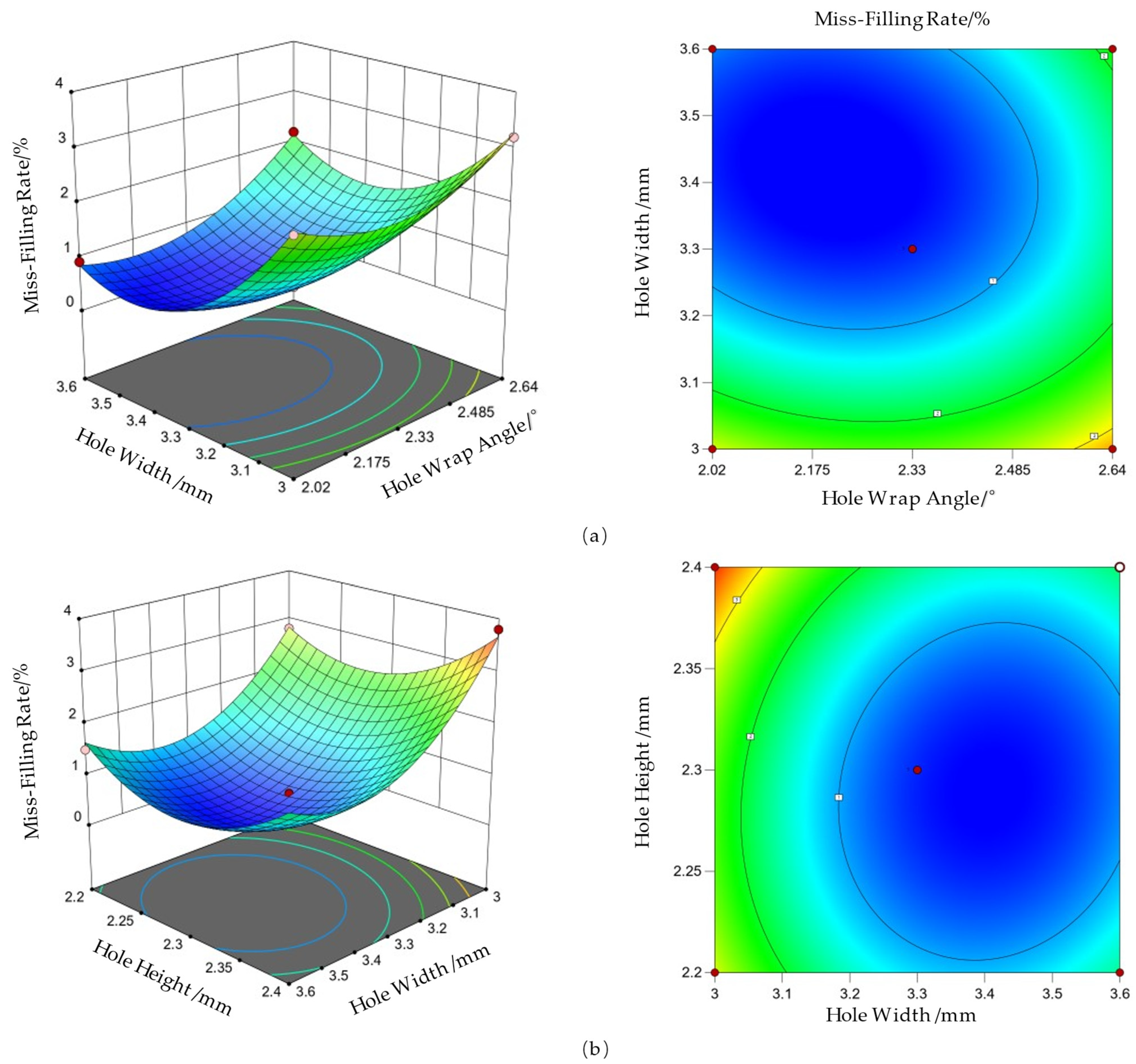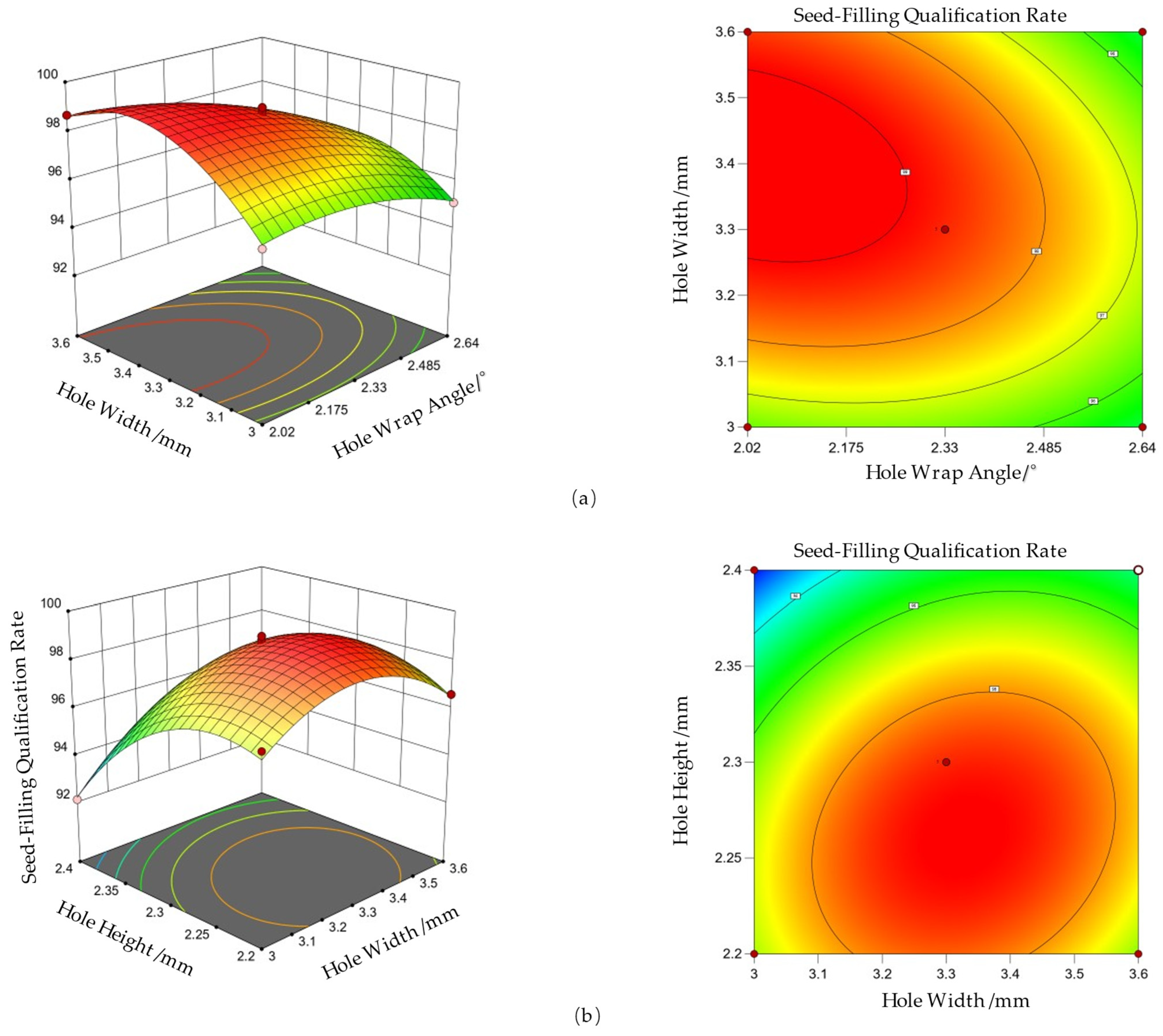 The hole structure includes radial and axial cross-sections of the hole. EDEM simulations were conducted to determine the influence and optimal values of the structural dimensions of the radial and axial cross-sections of the hole on seed-filling performance and seed jamming. To verify the improvement effect of the hole seeding performance proposed by theoretical analysis, the simulation experiment selected the seed-filling qualification rate, miss-filling rate, and multiple-filling rate as the evaluation indicators. One to three seeds per hole were considered qualified, more than 3 seeds as multiple-filling, and 0 seeds as miss-filling, which more intuitively reflects the requirements of precision seeding [29]. From the mechanical analysis of the seed-filling and seed-dropping processes, it can be known that the radial and axial cross-sectional dimensions of the hole determine whether the hole can stably fill seeds and smoothly drop seeds. Simulation experiments were conducted to explore the influence of the main structural parameters of the hole (hole wrap angle, hole width, and hole height) on the seed-filling qualification rate, miss-filling rate, and multiple-filling rate. The response surface methodology was used to carry out a three-factor, three-level quadratic regression orthogonal combination experiment to analyze the influence law of hole parameter changes on the seed-filling performance of Bessel holes and determine the optimal parameter combination of hole wrap angle, hole width, and hole height. The coding of simulation experiment factors is shown in Table 4.