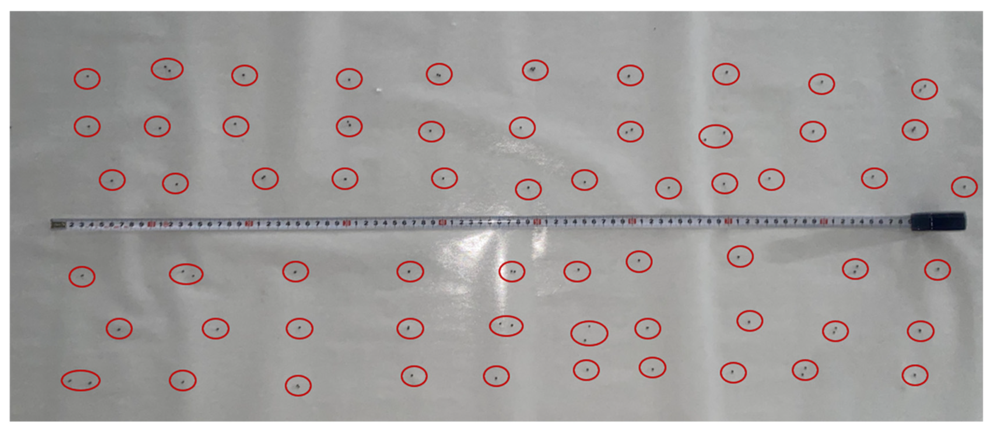 The forward speed of the machine is 2–5 km/h, the rotational speed of the hole wheel is 10–30 r/min, and the diameter of the hole wheel is 150 mm. The width of the direct seeder is 1.8 m, and 6 rows of rapeseed can be sown with an equal row spacing of 300 mm. The emergence rate of the rapeseed is set to 43% [21,22]. Taking the average value of the planting density range in Table 1, the average plant spacing is calculated to be 84.94 mm. After calculation and rounding, the number of holes Z on the rapeseed seed metering roller is determined to be 90.