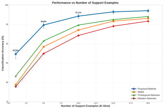 The adaptation speed for various shot configurations and methodologies is measured in Figure 12. The proposed AgriFewNet approach needs 41 gradient steps to converge in five-shot learning, which is 38.8% faster than MAML’s 67-step adaptation time and as efficient as Prototypical Networks’ (35-step) while still achieving higher accuracy. The meta-learning approach is validated for quick adaptation scenarios due to its significant advantage over fine-tuning (132 steps).