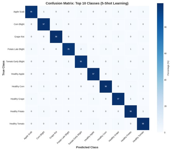 Over 10,000 training sessions were conducted, with 15 example questions for each class in each episode. With a batch size of 32, the meta-learning system employed learning rates of and , respectively. To improve model robustness, random rotation (), color jittering (brightness and contrast ), horizontal and vertical flips, Gaussian noise (), and mixup augmentation () were used systematically. The augmentation parameters were selected based on both prior studies in agricultural image augmentation and preliminary sensitivity analysis conducted in our experiments. The rotation range (±15°) aligns with established works on plant disease detection that simulate natural leaf orientation changes without geometric distortions. Color jittering values (brightness/contrast ±0.2) were adopted from widely used augmentation settings shown to preserve symptom visibility while improving robustness to lighting variations. We evaluated broader ranges (±30° rotation and ±0.4 jitter), but these caused unnatural distortions or reduced classification stability, supporting the chosen values.