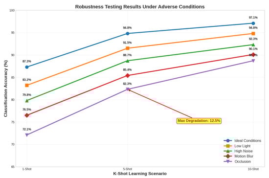 As shown in Figure 11, model performance is assessed in agricultural areas under genuine adverse situations. The model’s accuracy in five-shot learning is 94.8% under optimal imaging conditions. Under low light, performance deteriorates somewhat to 91.5%, highlighting the advantages of attention processes that improve contrast in areas with low illumination [32].
