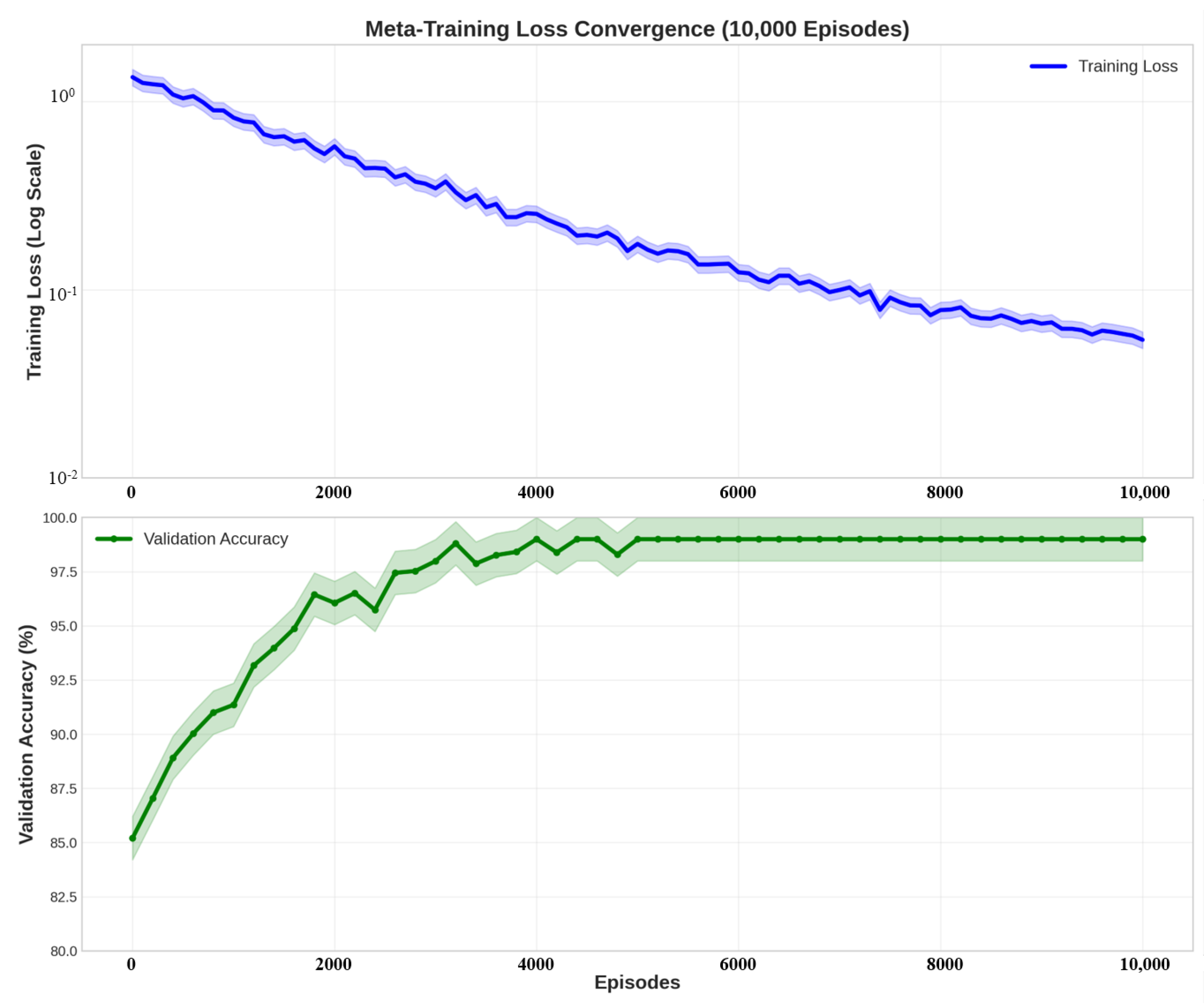 Figure 2. Within the first 2000 episodes, the training loss shows quick initial convergence. Next, it refines gradually, stabilizing at about 0.02 after 8000 episodes. With little fluctuation, the validation accuracy curve shows a consistent improvement from 85% at initialization to a plateau of 96.3% at convergence, suggesting strong learning dynamics and successful generalization to new tasks.