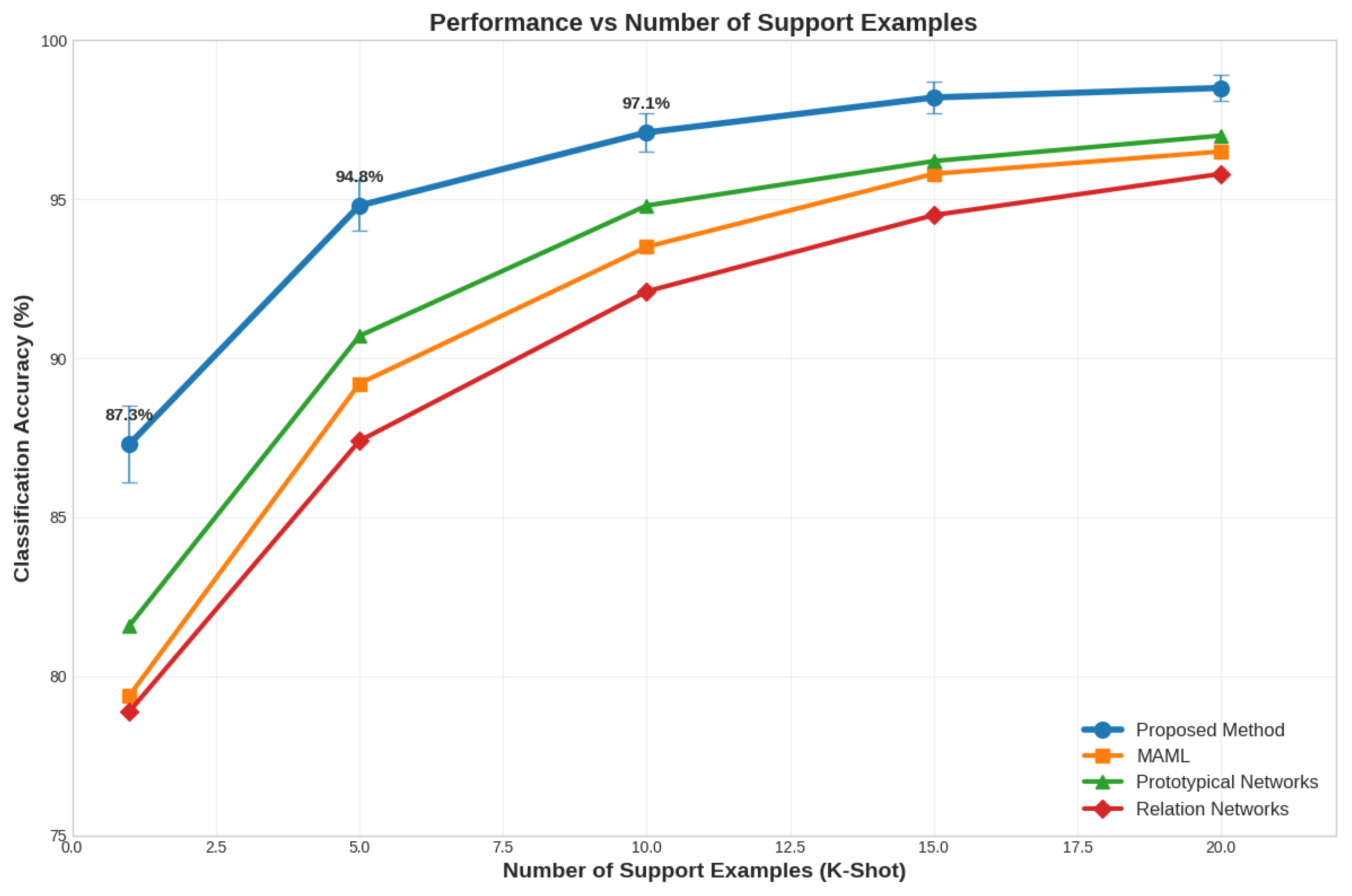 A detailed comparison of classification accuracy as a function of support example quantity is shown in