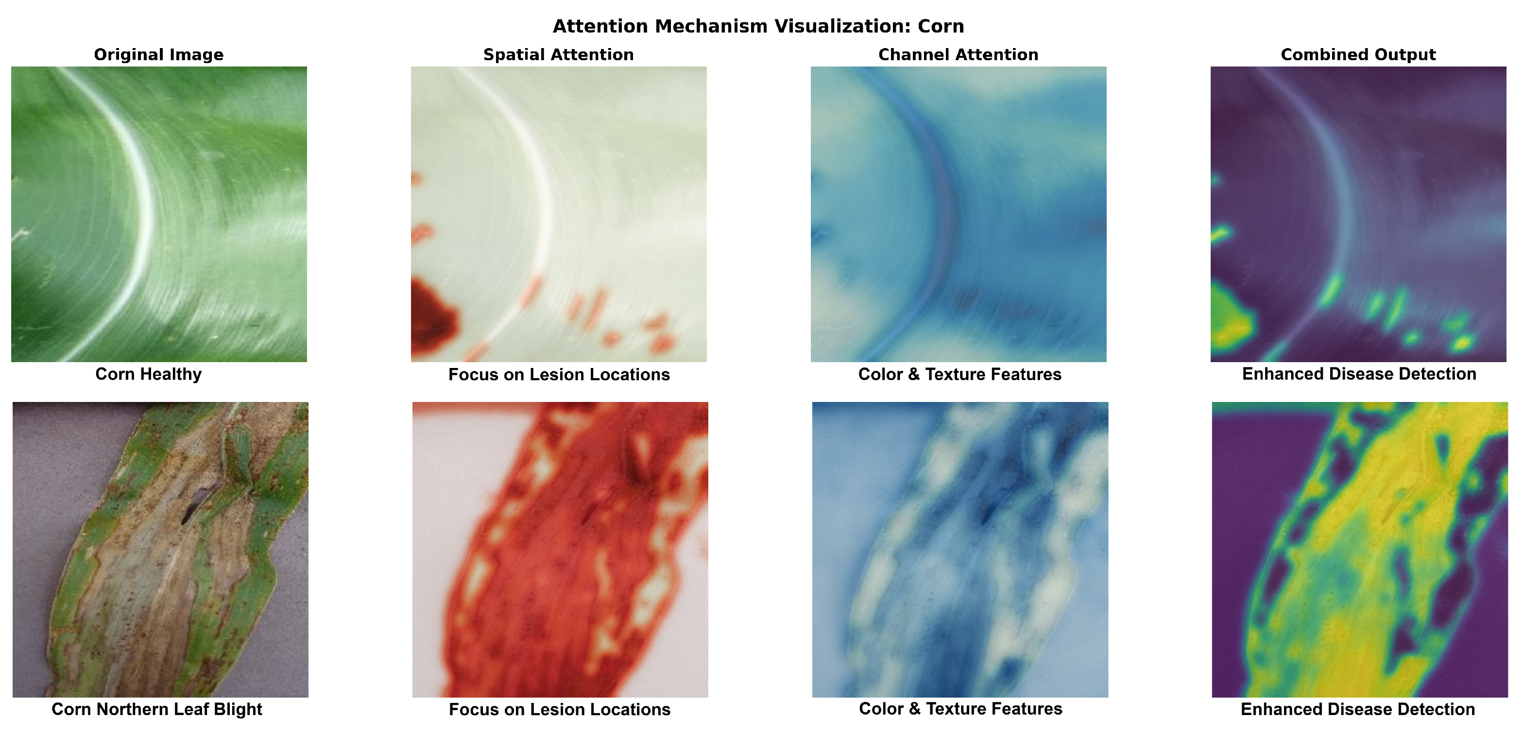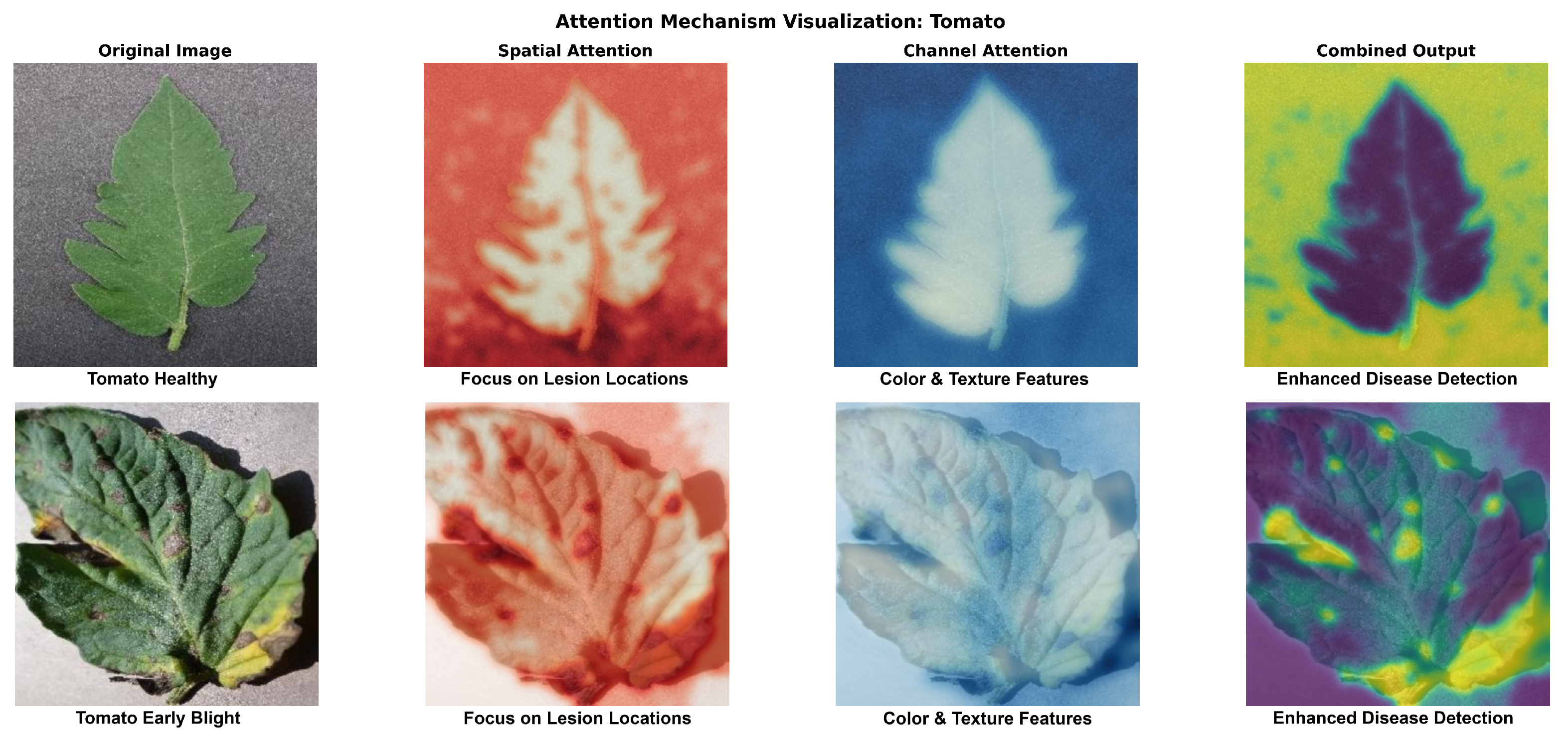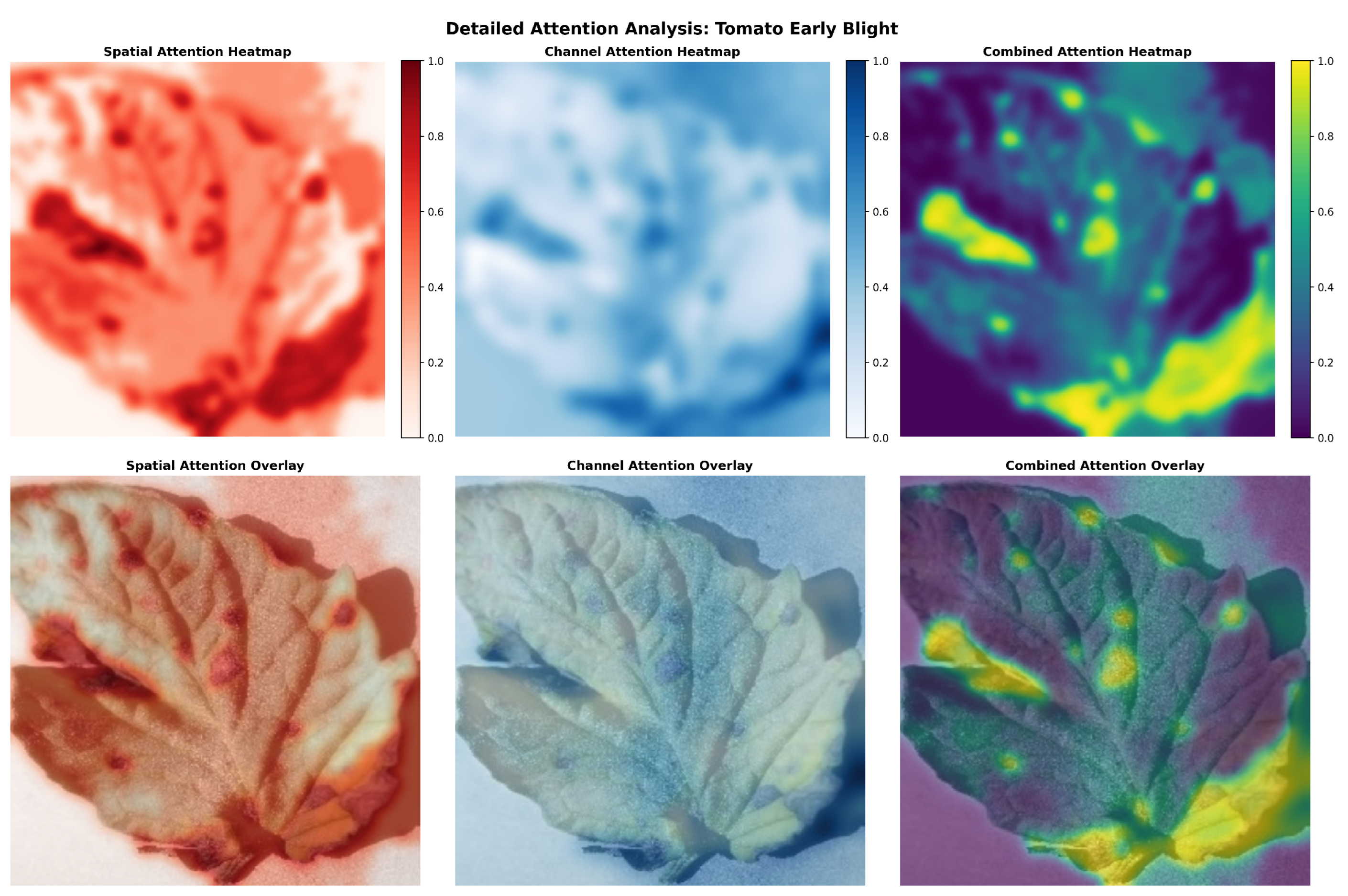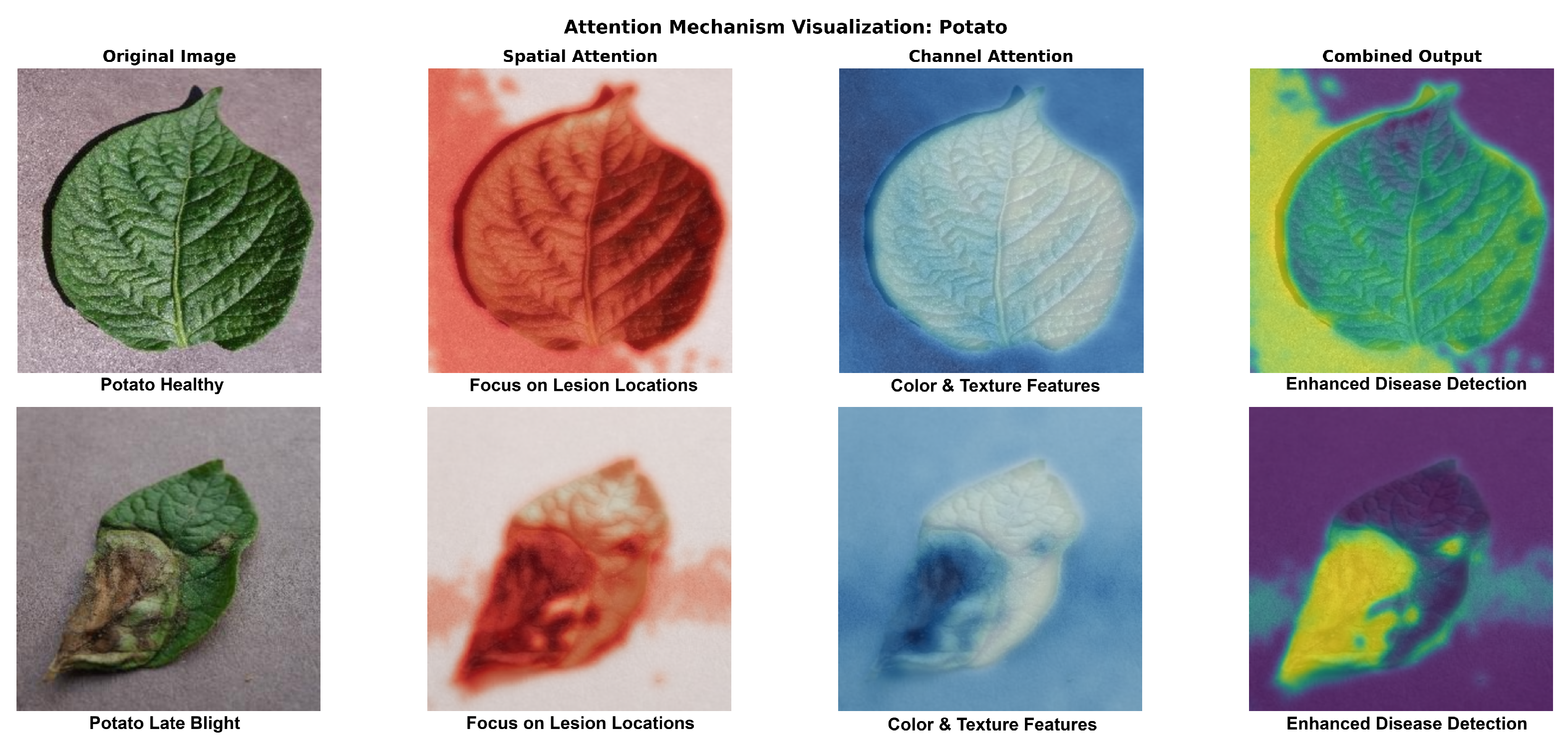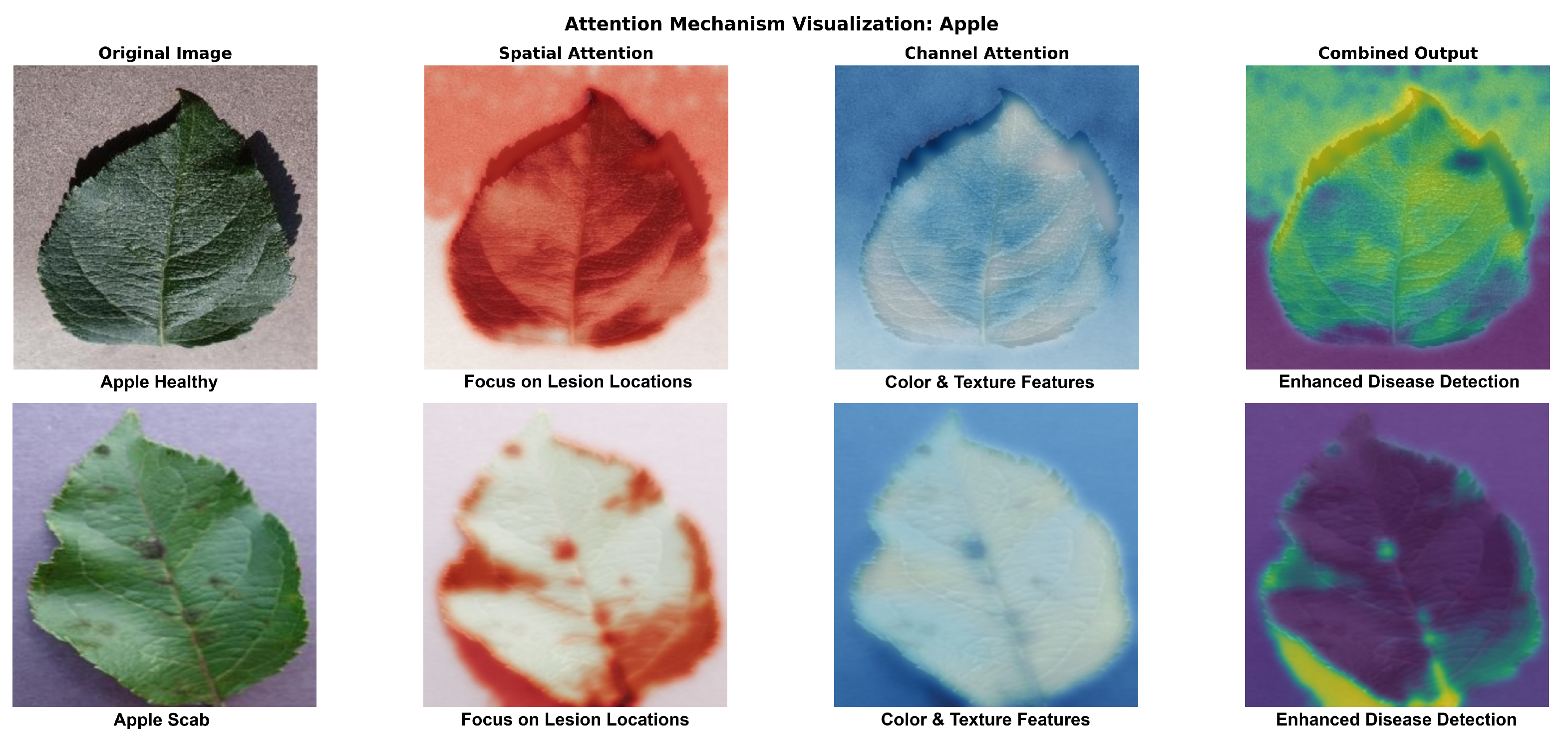 Figure 7) are used to illustrate the learned attention patterns. With high activation values (red coloring) that perfectly match lesion boundaries and symptomatic locations, the spatial attention module locates disease-affected regions with success. As seen in