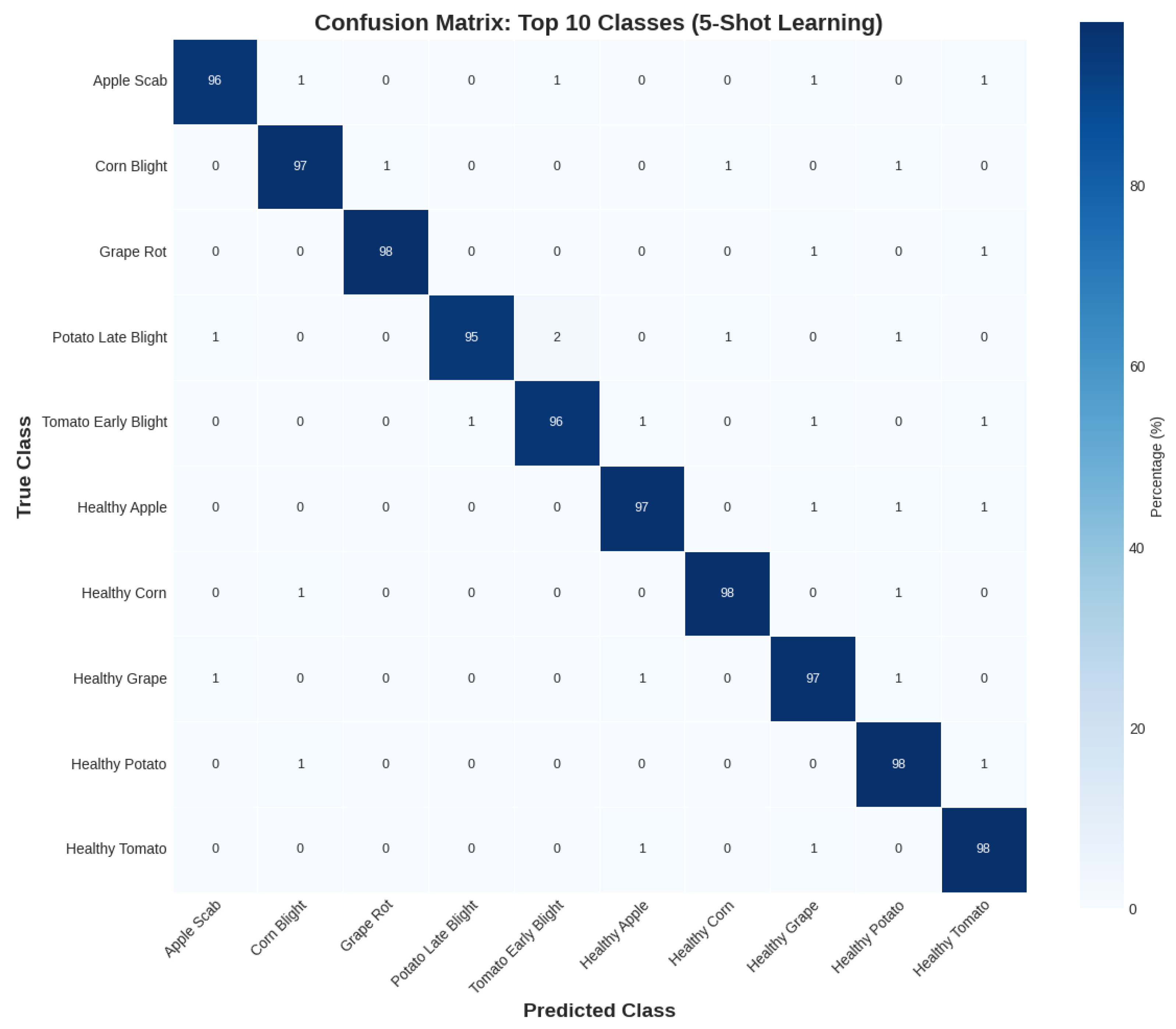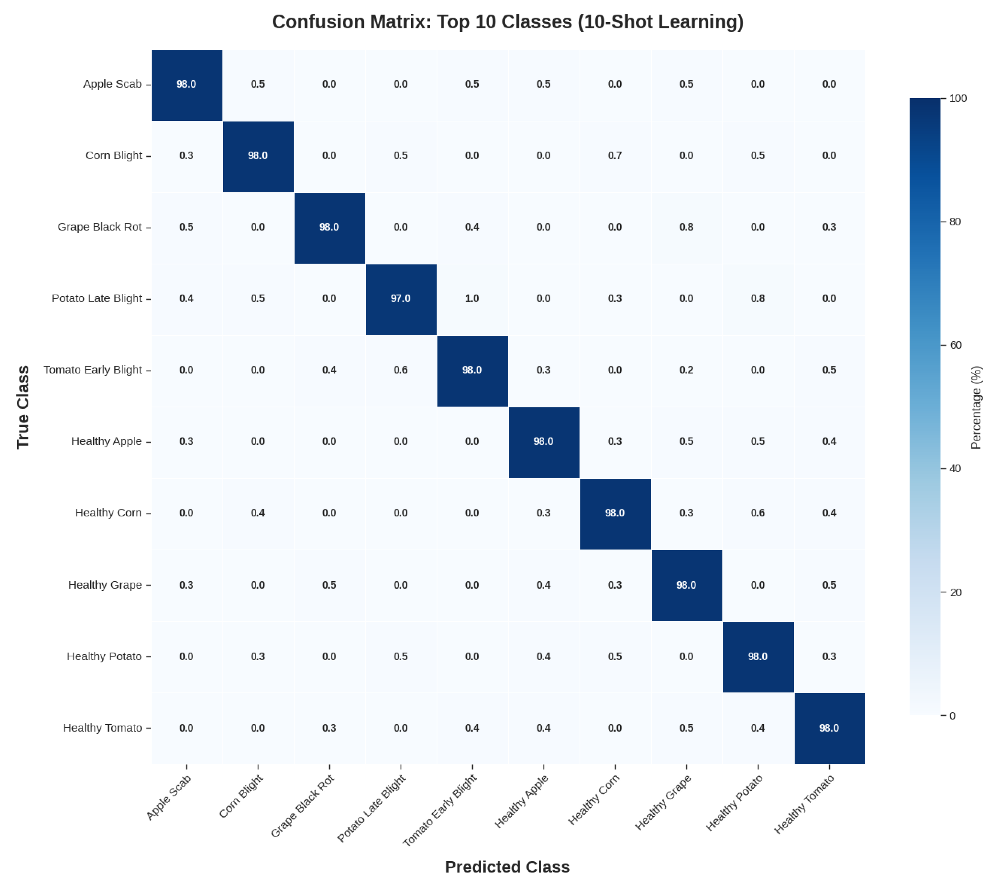 Figure 10 shows outstanding classification performance. Consistently displaying 98.0% accurate predictions, diagonal values demonstrate strong discriminative ability. Small misclassifications mostly happen between diseases that are visually similar: diseased leaves are sometimes mistaken for healthy ones (0.3–0.8%), and potato late blight is mistaken for tomato early blight (1.0%). Model learning appears to be balanced based on the symmetric error distribution. The effectiveness of the suggested few-shot learning methodology in agricultural disease classification with limited training samples is validated by the notable lack of cross-species disease confusion (<0.5%) and the high specificity (98.0%) maintained by healthy classes.