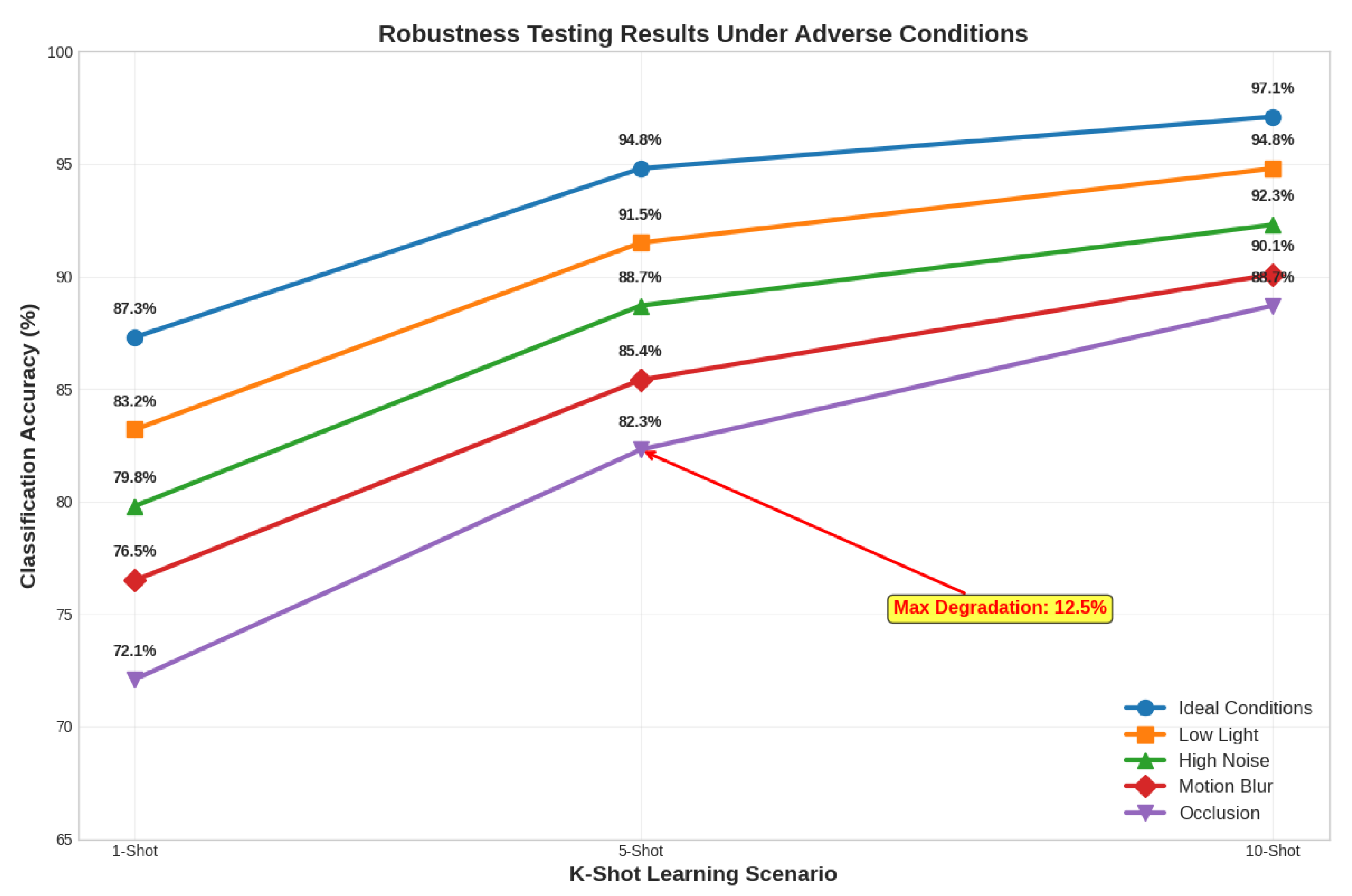 In higher-shot settings, the performance decline is less severe; even in occlusion, 10-shot learning maintains an accuracy of above 90%. A useful feature for reliable real-world deployment; this implies that extra support examples offer redundancy that makes up for unfavorable circumstances. The attention processes concentrate on less damaged areas and feature channels, which helps to somewhat alleviate the negative effects of unpleasant conditions.