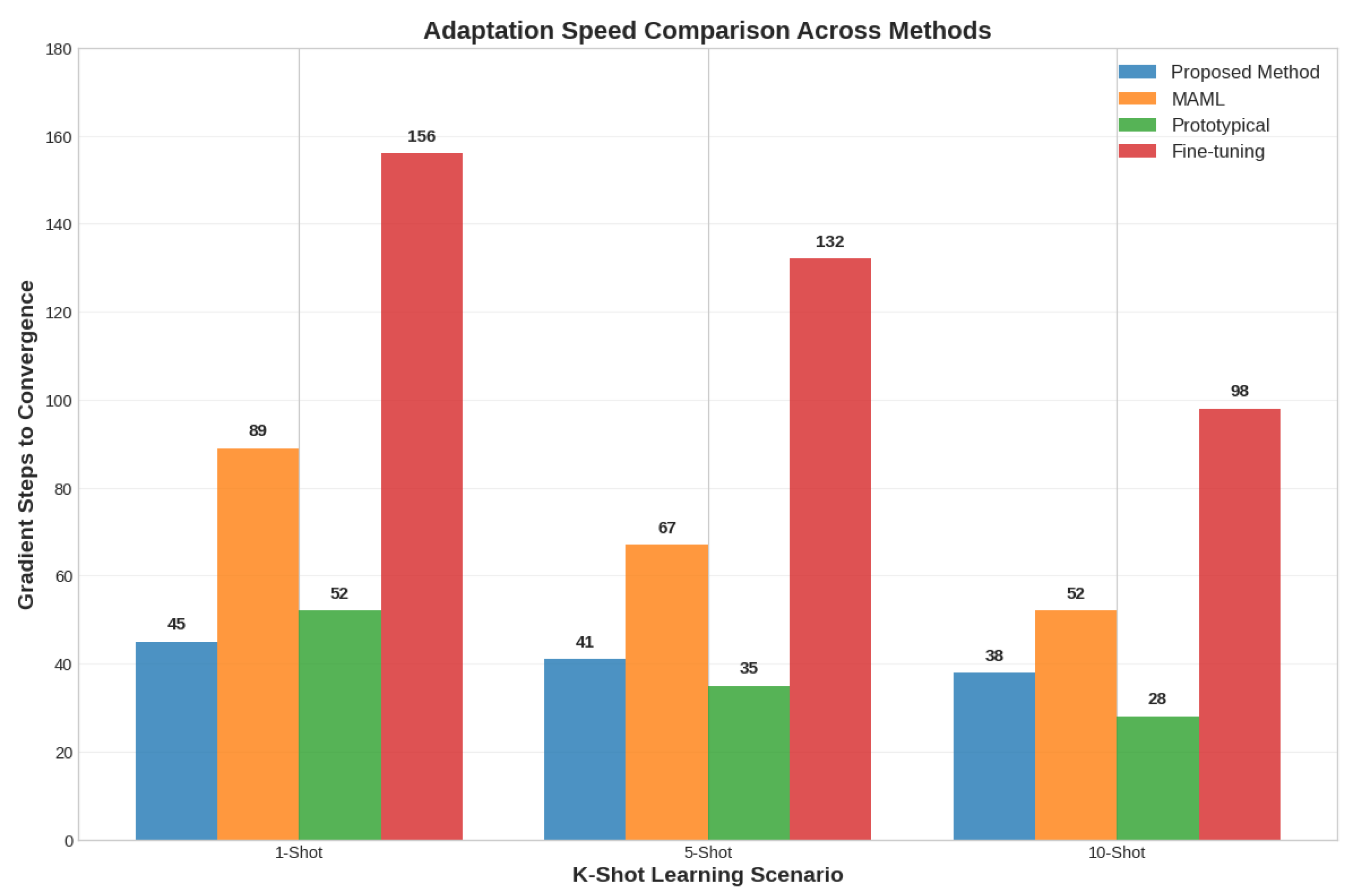Figure 12. The proposed AgriFewNet approach needs 41 gradient steps to converge in five-shot learning, which is 38.8% faster than MAML’s 67-step adaptation time and as efficient as Prototypical Networks’ (35-step) while still achieving higher accuracy. The meta-learning approach is validated for quick adaptation scenarios due to its significant advantage over fine-tuning (132 steps).