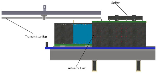 The proposed configuration, illustrated in Figure 1, consists of an actuation unit and a transmitter bar designed to operate within the elastic regime during testing. The actuation unit is composed of two parallel-mounted linear electric motors (SL2-P250M, SEW Eurodrive, Bruchsal, Germany), which transmit linear motion to a striker of approximately 10 kg. Each motor includes two components: the primary, a stationary assembly that houses the stator and electromagnetic windings, and the secondary, on which the striker is mounted to prevent any impact-induced damage to the primary. During operation, the electromagnetic field generated by the primary drives the secondary along precision linear guides, directly converting electrical energy into translational motion.