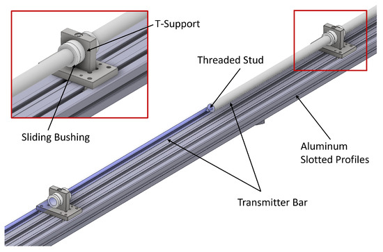 Both the striker and the transmitter bar are made of 316L stainless steel and have a diameter of 60 mm and 30 mm, respectively. The transmitter bar is m long and, considering an elastic modulus, E, of 200 GPa and a density, of 7850 kg/m3, the time, , for the elastic compressive wave to travel along the length of the transmitter bar and get reflected back to the sample is approximately ms, computed from the equation , where C is the longitudinal sound speed wave of the material (). However, strain gauges are positioned 350 mm from the sample, which reduces the test duration to approximately ∼5.6 ms. The bar is composed of shorter 3 m bars, connected, as illustrated in Figure 2, by a threaded stud to guarantee proper contact between the normal surfaces of adjacent sections, thus preventing the generation of unwanted release waves caused by discontinuities [8]. The bars are supported by ten T-shaped supports positioned at approximately m each. As shown in Figure 2, each support houses a sliding bushing to minimize friction, favoring the free axial movement of the bar during testing. The supports are mounted on aluminium slotted profiles (Bosch-Rexroth, Lohr am Main, Germany), which provide high flexural stiffness and high straightness and allow for the easy positioning and precise alignment of the bar.