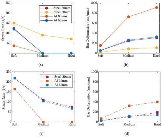 Example of results extracted during the numerical optimization of the device, considering different bar diameters and materials, after the impact of a 10 kg striker at 1 m/s. (a,b) Average strain rate and transmitter bar deformation achieved for a 6 mm cylindrical sample made of different materials (soft = copper; medium = Hardened Steel; and hard = Ti6Al4V) (c,d) and for a 4 mm cylindrical sample.