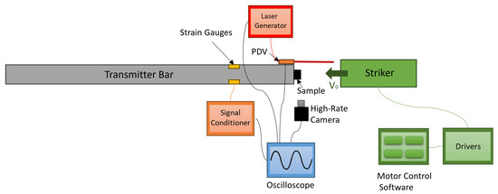 Schematic representation of the testing configuration showing the striker, specimen, and transmitter bar. The PDV probe is aligned with the transmitter bar axis.