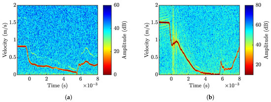 STFT maps of the PDV velocity signal for two impact velocities: (a) s−1 and (b) s−1.