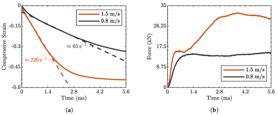 Data extracted during testing: (a) strain history and (b) load evolution. Only one representative curve for testing velocity was selected, given the repeatability of the measured data. The dashed lines represent the fitted lines in the regions of deformation at a constant strain rate.