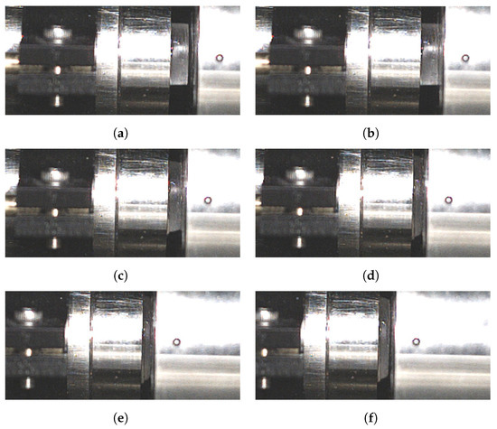 High-speed camera frames recorded during impact at 1.5 m s−1. (a) Initial configuration before testing. (b) Moment of impact (t = 0 ). (c) 1 after impact. (d) 2.4 after impact. (e) 5.7 , significant transmitter bar sliding. (f) 8.2 , separation between the striker and the specimen.